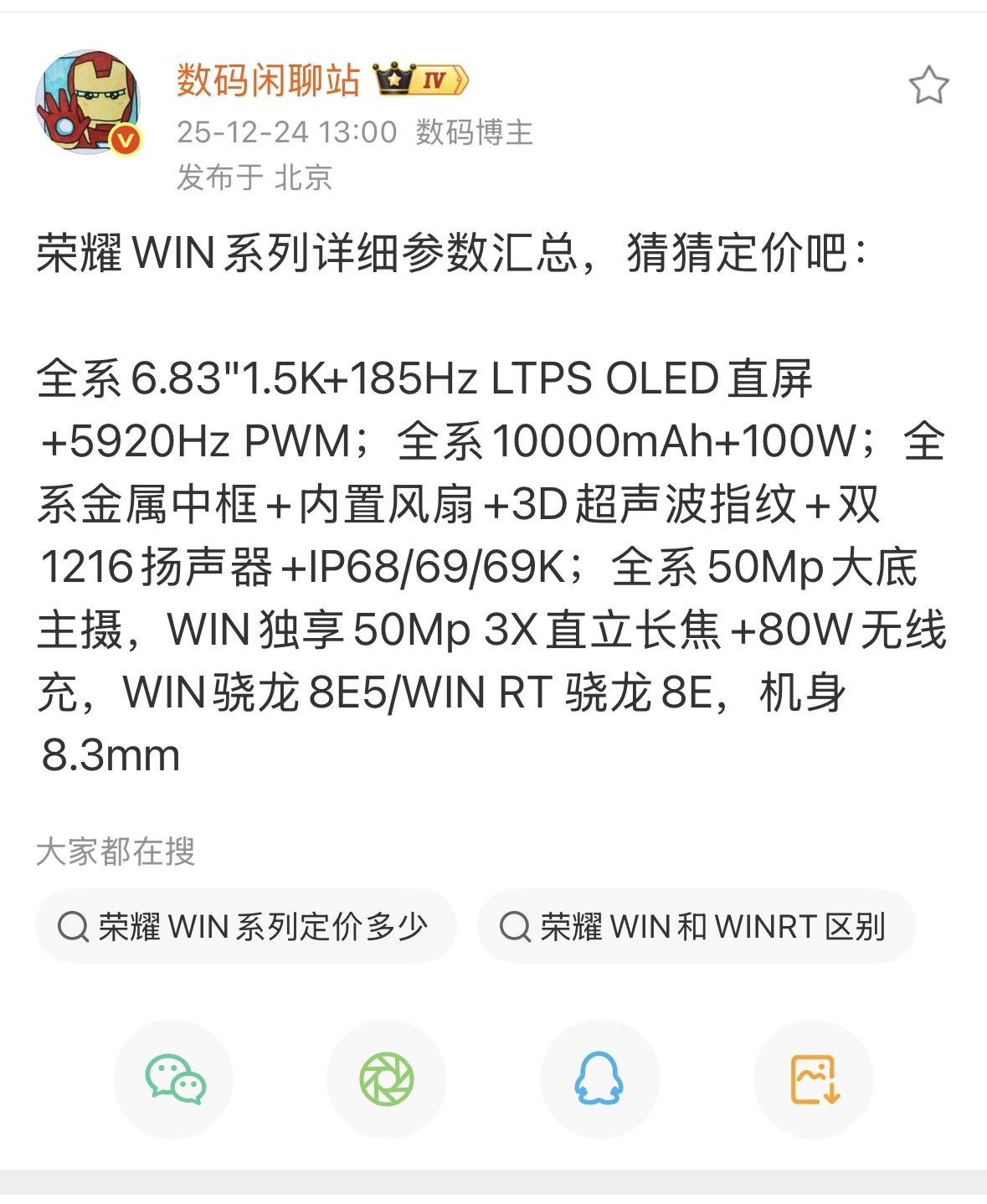 荣耀WIN系列真的赢麻了,从性能到影像等处处玩起了内卷 随着发布会的越趋接近,荣耀WIN系列的更多爆料浮上水面。例如采用了6.83英寸的1.5K LTPS OLED直屏,并且其刷新率高达185Hz,结合超高频的调光技术,用起来既流畅又护眼。性能这块也不含糊,直接搭载了骁龙8 Elite Gen5处理器,性能非常强劲,跑分超过440万。拍照还给到了5000万像素的大底主摄,再结合一个5000万像素的3倍直立长焦镜头,能拍得更远更清晰。续航更是炸裂,它用了10000mAh的大电池,还支持80W无线快充,充电速度很快。 而且机身还控制的十分轻薄,反正就这个堆料,个人觉得很有可能一机难求,毕竟它的价格肯定会有惊喜的,各位觉得怎么样?
