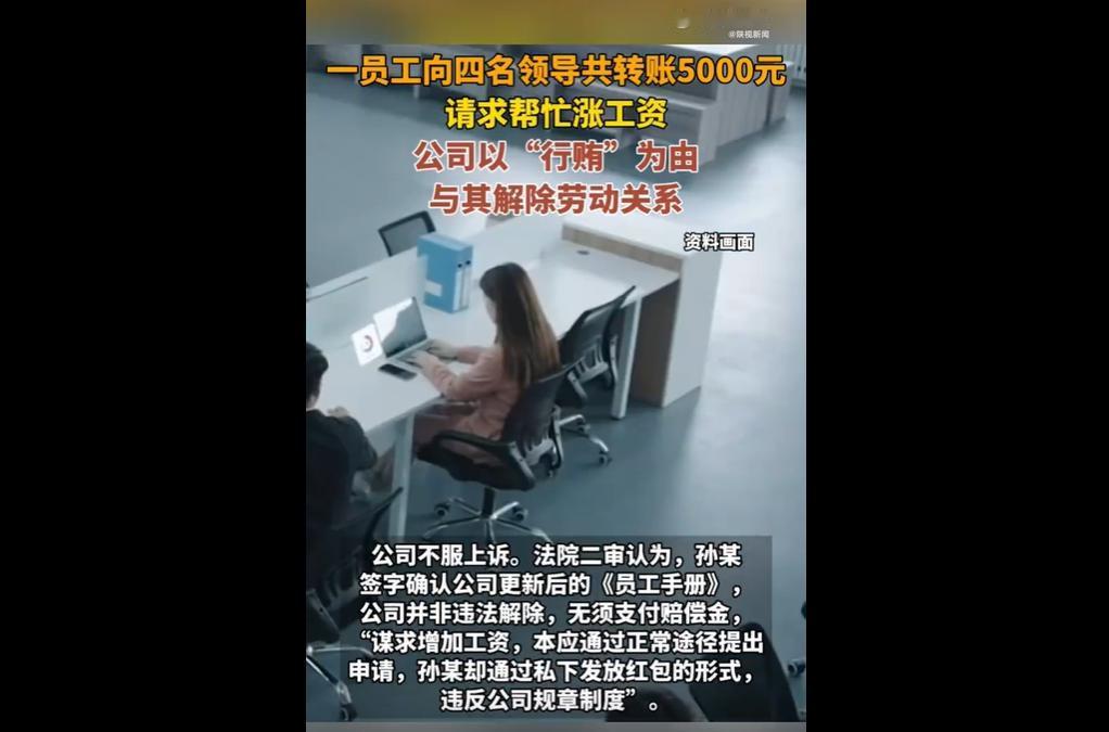 安徽某物业公司员工孙某月薪3850元,分4次给4位领导转5000元求加薪,被公司以“行贿”为由开除。案件经仲裁、三级法院审理,最终再审裁定公司解除合同合法,驳回孙某诉求。 这起职场闹剧,简直是“偷鸡不成蚀把米”的现实版! 孙某月薪不足4000,却咬牙给领导塞5000红包求加薪,脑子简直进了水,单论这份“魄力”就蠢得离谱! 加薪靠的是业绩和能力,不是靠舔领导、送红包的歪门邪道! 更可笑的是,他大概率以为“礼多人不怪”,却没料到会被公司当成“典型”开除,最后钱没了、工作丢了,连赔偿金都没拿到,纯属自食恶果! 不过,公司以“行贿”为由开除孙某,看似合规,实则藏着太多猫腻! 旧版《员工手册》压根没有“行贿”条款,新版手册制定和公示程序还存疑,却能凭着员工签收记录就认定违规,这规则简直是为了开除人“量身定制”! 更讽刺的是,4位领导收了红包却没被追责,反而只有送礼的员工被开除,这双标操作简直没谁了! 收礼的安然无恙,送礼的被扫地出门,难不成公司的规章制度只针对底层员工? 公司是不是借“反腐”之名,行“清理员工”之实呢? 这样的操作,既能撇清自己的责任,又能树立“严管”的形象,算盘不要打得太响!