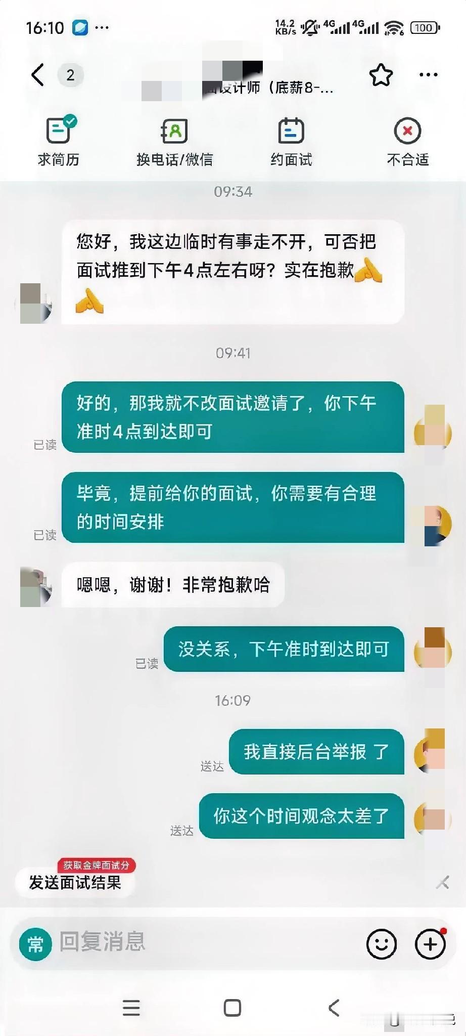 这是约到艮hr了[捂脸]约个面试,候选人先是表示自己无法按照原定的约面试间到面,沟通hr是否可以把面试时间更改到下午四点。hr这边协调面试官同意更改时间后,候选人却“失联了”[笑哭]结果就是hr反手给候选人一个举报... 对于这样的情形,相信从候选人的视角看,很多人会觉得这个hr有点大惊小怪,甚至觉得候选人失约没啥大不了的,反而是这个hr过于玻璃心... 但是作为hr同行,我们是能理解这名同行破防的原因:候选人先是更改面试时间,然后再失联。这种情况hr还好说,主要是面试官那边不好交代:你让面试官把时间腾出来,最后人没来,这不是协调了个寂寞嘛[捂脸] 面试官会觉得候选人没谱的同时,hr没有识别出来也是一种错[捂脸]