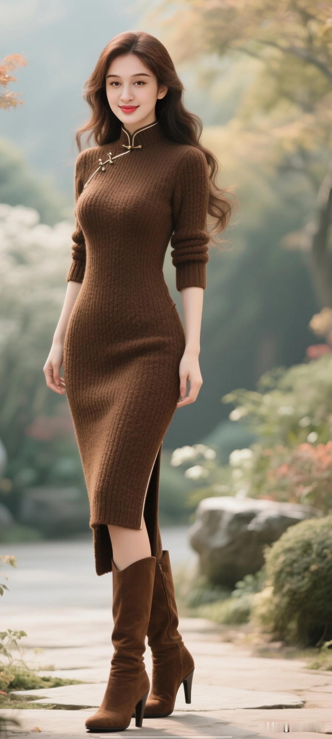 优雅东方韵,秋日暖阳下,一袭棕色针织裙,尽显温婉气质。