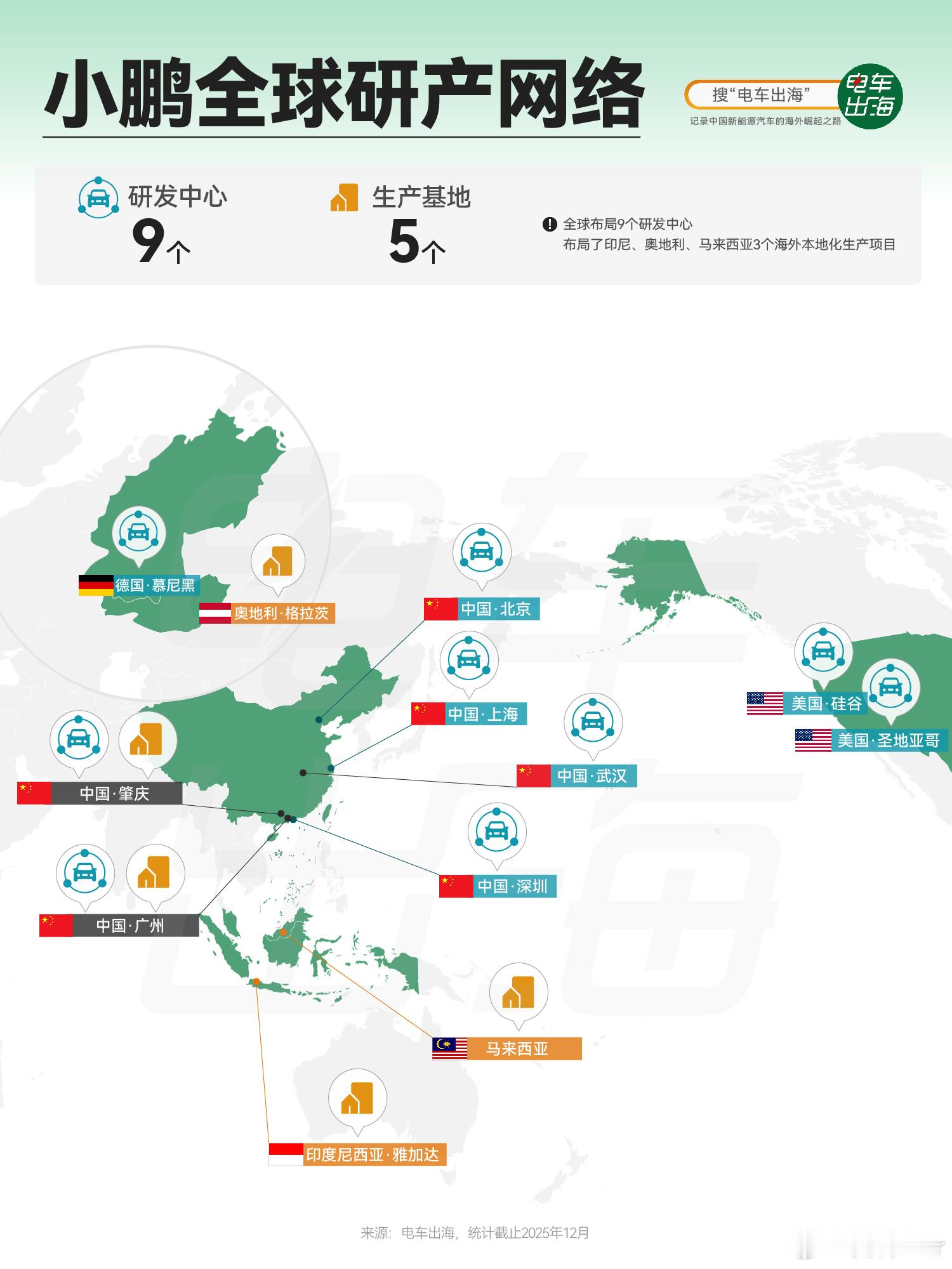 小鹏汽车2025年前11个月海外市场交付量达39,773台,同比增长95.0%。数据显示,其在亚太(含中国)市场前11个月销量同比增速高达170%,欧洲同比增长161%,中东同比增长66%,全球同比增长高达156%。今年11月,小鹏在北欧市场的销量位列中国品牌销冠。1-11月,小鹏在10个国家位列中国新势力纯电品牌第一,在另外8个国家排名第二,展示出强劲的发展势头。为支持全球业务拓展,小鹏已建立覆盖超50国321家海外销售服务网点,并在全球布局9个研发中心。今年以来,小鹏于印尼、奥地利(与麦格纳合作)、马来西亚三地落地海外本地化生产项目,这标志着小鹏正从产品出口向“研发+制造”一体化的全球智造模式深化推进。小鹏获海外10国新势力销量第一小鹏夺北欧中国品牌销冠