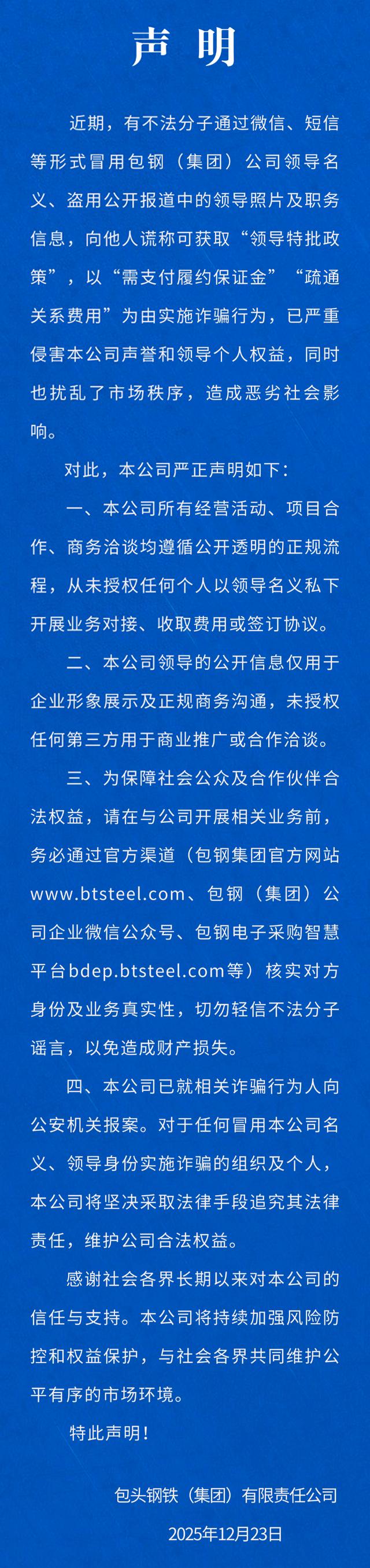 12月23日,包头钢铁(集团)有限责任公司发布紧急声明称,近期,有不法分子通过微信、短信等形式冒用包钢(集团)公司领导名义、盗用公开报道中的领导照片及职务信息,向他人谎称可获取“领导特批政策”,以“需支付履约保证金”“疏通关系费用”为由实施诈骗行为,已严重侵害公司声誉和领导个人权益,同时也扰乱了市场秩序,造成恶劣社会影响。