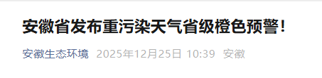 12月25日,安徽省生态环境保护委员会办公室发布重污染天气省级橙色预警: