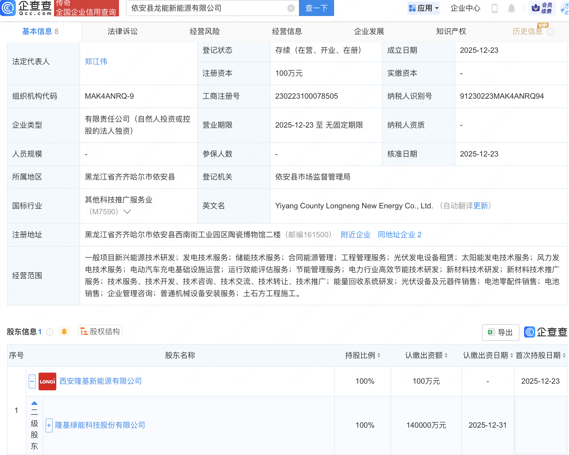 企查查APP显示,近日,依安县龙能新能源有限公司成立,经营范围包含:电动汽车充电基础设施运营;运行效能评估服务;节能管理服务;电力行业高效节能技术研发等。企查查股权穿透显示,该公司由隆基绿能(601012)间接全资持股。
