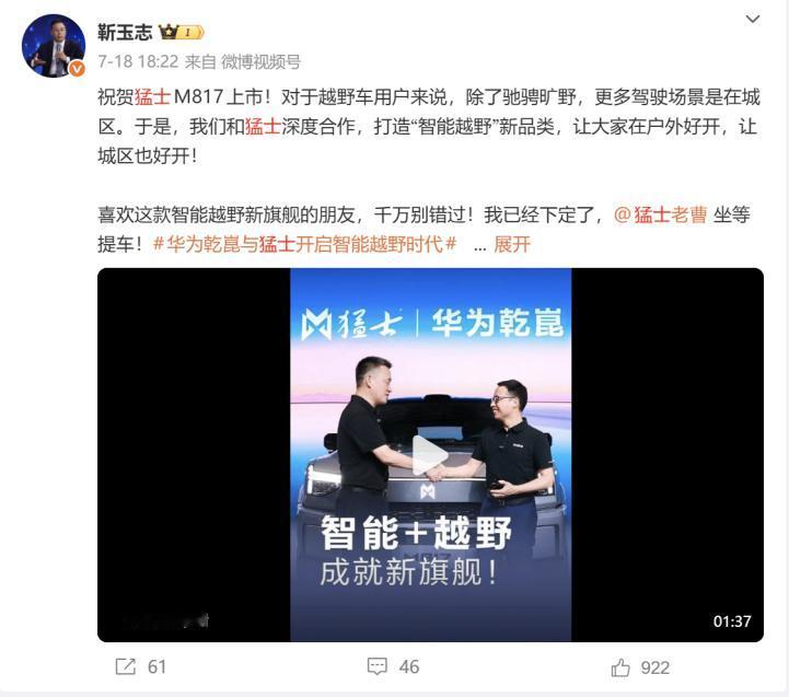 正式交付!华为智能汽车解决方案BU CEO靳玉志提车猛士M817啦! 实话实说,当他亲自接过车钥匙的那一刻,对双方合作就迈入了新阶段。作为华为乾崑与猛士携手打造“智能越野第一车”猛士M817身上,可是有着“满血华为乾崑系统”的,像是大家熟悉的乾崑智驾ADS 4、鸿蒙座舱5、乾崑车云、智能车控、星闪数字钥匙等等,通通都有,不仅在城市好开,在野外山区一样轻松自如,名副其实的“可城可野可远方“。 回顾猛士M817的成长轨迹,每一次亮相都充满惊喜。9月,车辆历经严苛夏测,在高温、复杂地形的极限挑战中,其坚固的车身结构、全铝底盘与华为乾崑CAS 4.0全维防碰撞系统的组合尽显实力,主被动安全拉满。12月,随着向华为智能汽车解决方案BU CEO靳玉志的正式交付,这款车的产品力得到核心圈层背书,标志着猛士与华为乾崑的协同合作迈入新的阶段。 猛士与华为乾崑的“智野同行”,不仅打造出“智能越野第一车”这一行业标杆,更重构了户外出行的价值逻辑。猛士M817用“全栈华为、全域通达”的五全实力,让“可城可野可远方”的出行向往照进现实。马上就要春节假期了,大家放假没事的时候带上家人朋友,试驾体验下看看吧。华为乾崑 猛士M817