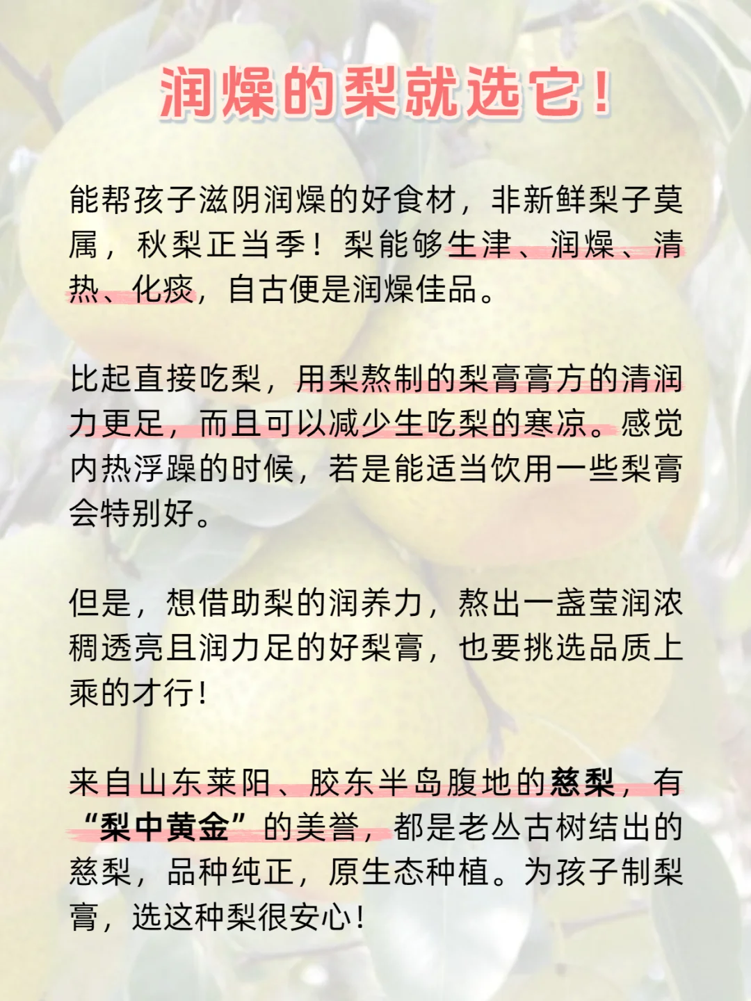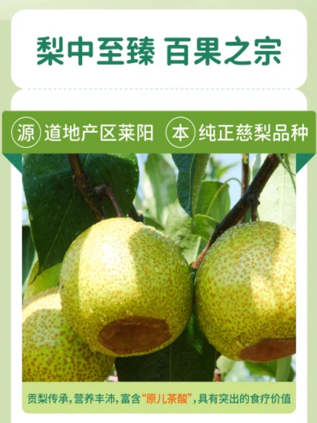 [向右R]来自山东莱阳、胶东半岛腹地的慈梨,有“梨中黄金”的美誉,都是老丛古树结出的慈梨,品种纯正,原生态种植。为孩子制梨膏,选这种梨很安心!