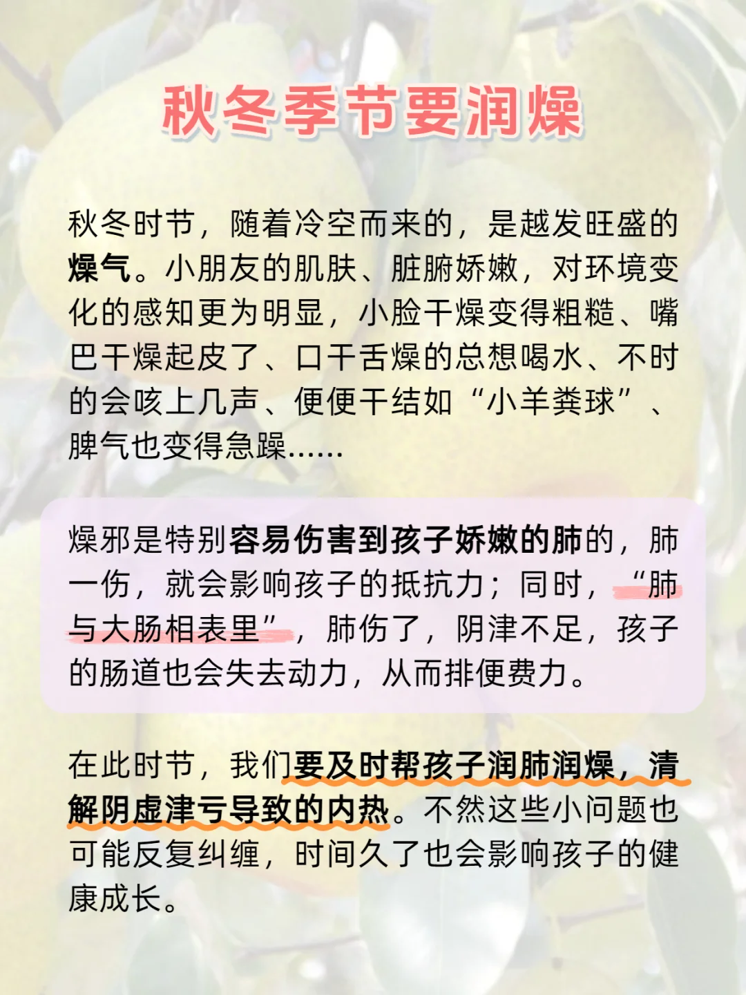 秋冬时节,随着冷空而来的,是越发旺盛的燥气。小朋友的肌肤、脏腑娇嫩,对环境变化的感知更为明显,小脸干燥变得粗糙、嘴巴干燥起皮了、口干舌燥的总想喝水、不时的会咳上几声、便便干结如“小羊粪球”、脾气也变得急躁……