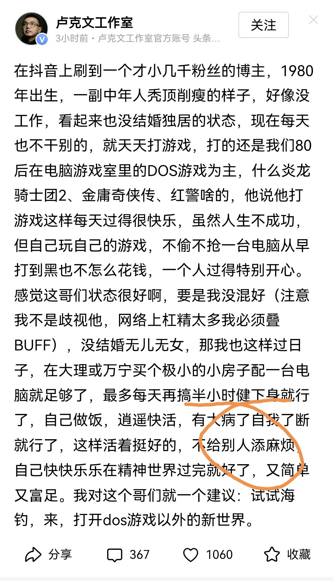 卢克文这句话说到我心坎上了,“不要给别人添麻烦”!讲真,怎么过都可以,只要自己不影响他人,就没必要要求别人怎样!