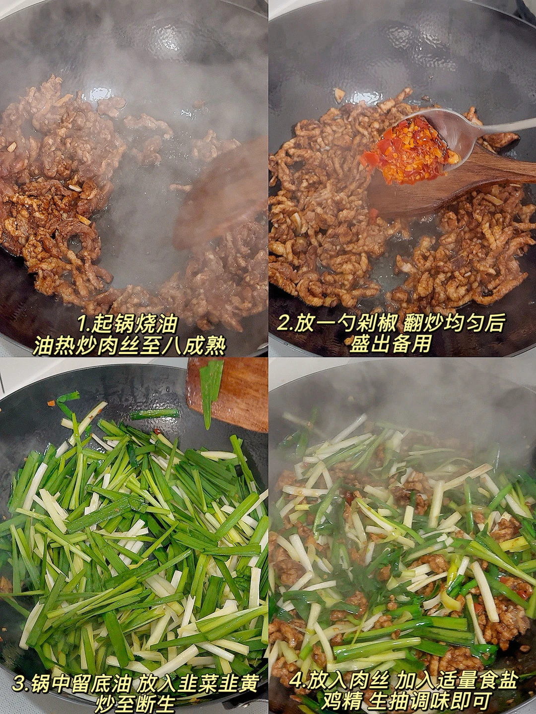 拌米饭能连炫两碗,简简单单的家常菜,却好吃到让人念念不忘! 📜食材:韭菜、韭黄、猪肉丝(调味见图5) 🍳做法:起锅烧油,油热炒肉丝至八成熟,放入一勺剁椒,翻炒均匀后盛出备用➡️锅中留底油,放入韭菜韭黄,炒至断生➡️放入肉丝,加入适量食盐,鸡精,生抽调味即可。