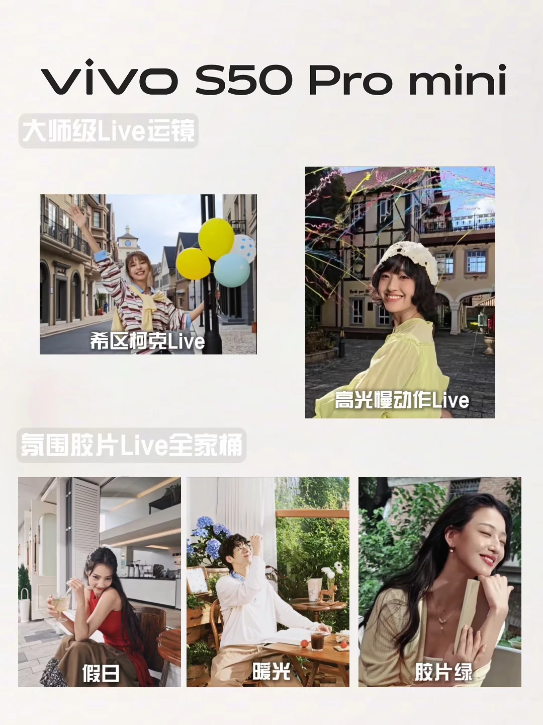 还有变焦运镜和希区柯克运镜,氛围感胶片Live全家桶,现在都能用S50 Pro mini一键拍出来,暖光、假日等等复古滤镜自带胶片感,新手小白也能一秒拍出胶片感Max的Live照片