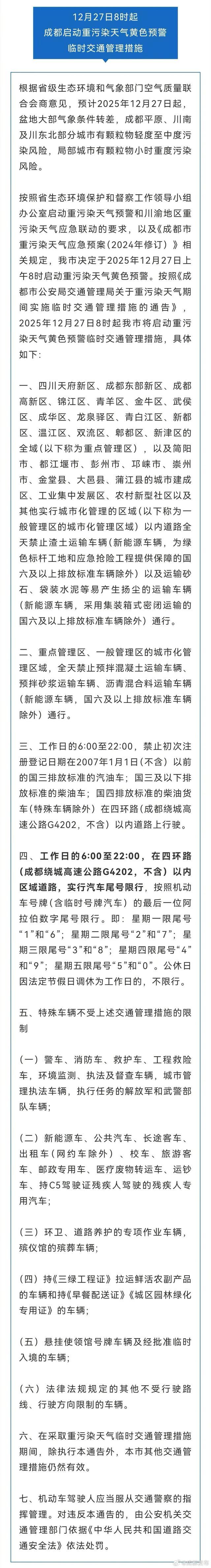 按照省生态环境保护和督察工作领导小组办公室启动重污染天气预警和川渝地区重污染天气应急联动的要求,以及《成都市重污染天气应急预案(2024年修订)》相关规定,我市决定于2025年12月27日上午8时启动重污染天气黄色预警。按照《成都市公安局交通管理局关于重污染天气期间实施临时交通管理措施的通告》,2025年12月27日8时起我市将启动重污染天气黄色预警临时交通管理措施,具体如下↓↓