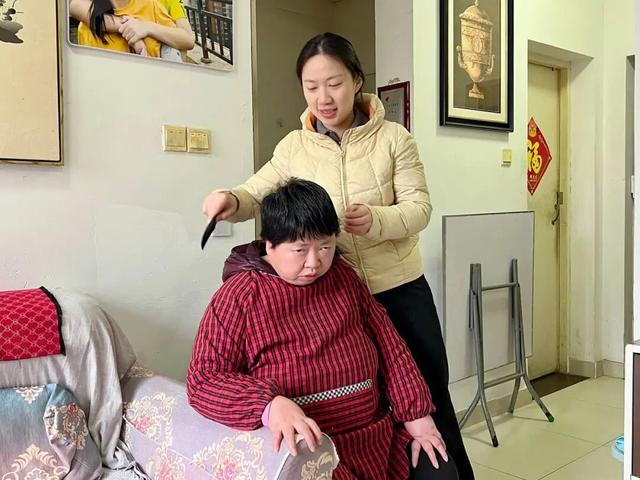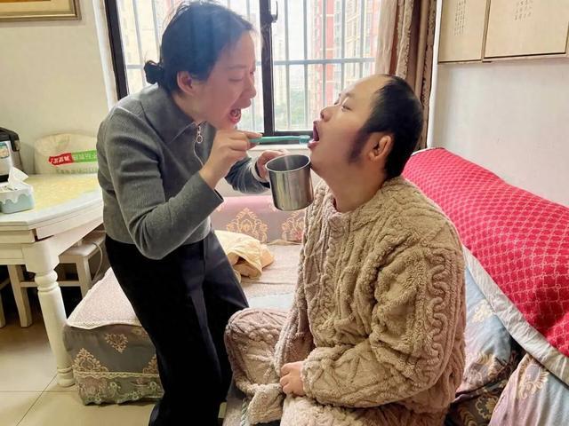 这处三四十平米的公租房,是政府为这个特殊家庭提供的温暖港湾。房间不大,却被收拾得一尘不染,衣物叠放整齐,餐桌上摆着简单的餐具,处处透着主人的细心。王倩来不及歇口气,就径直走向房间,那里躺着她25岁的弟弟王成财。弟弟5个月大时被诊断为脑瘫,生活无法自理,此刻正闹着脾气,拒绝刷牙。王倩轻声哄着,弯腰背起140斤的弟弟在房间里慢慢转圈,温柔的话语在耳边萦绕,弟弟紧绷的情绪渐渐舒缓,终于乐意配合。光是刷牙这件小事,就用了十几分钟,随后她又耐心地帮弟弟洗脸、整理衣物,动作娴熟又轻柔。安顿好弟弟,她又转身照料患有精神疾病的母亲,重复着同样的流程,每一个细节都饱含着深情。“我一直感觉自己的时间不够用,每天每刻都有固定的事要去做。”王倩擦了擦额头的汗,语气平淡却坚定。
