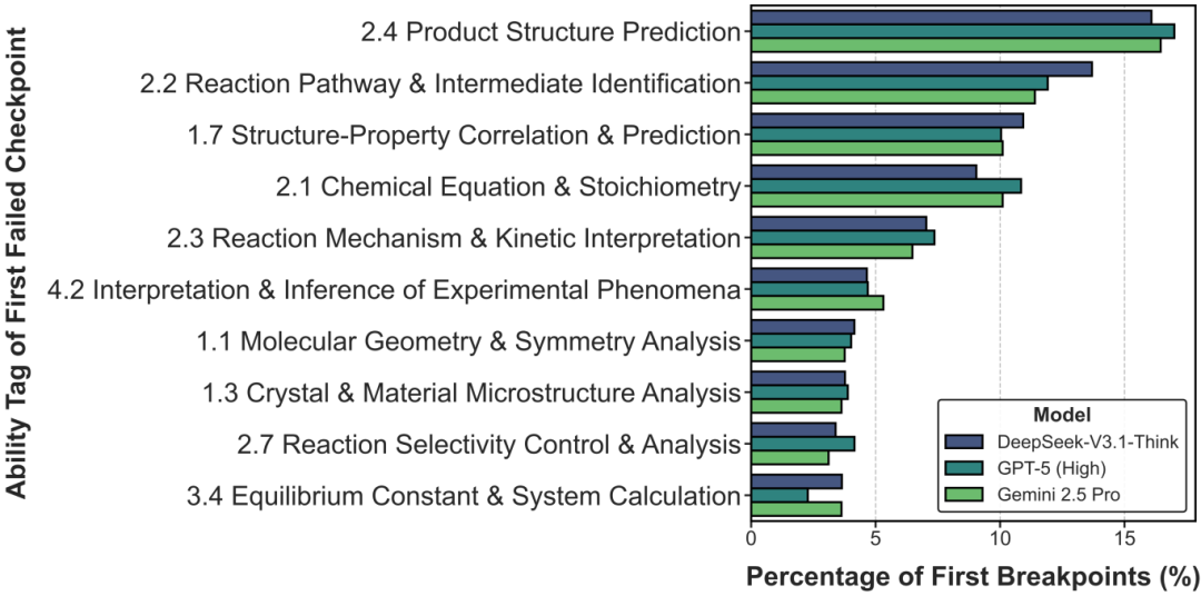 团队发现,AI的推理链条往往断裂于产物结构预测、反应机理识别以及构效关系分析等高阶任务。当前的顶尖模型虽然拥有海量的知识储备,但在处理需要严密逻辑和深刻理解的硬核化学问题时,仍显得力不从心。