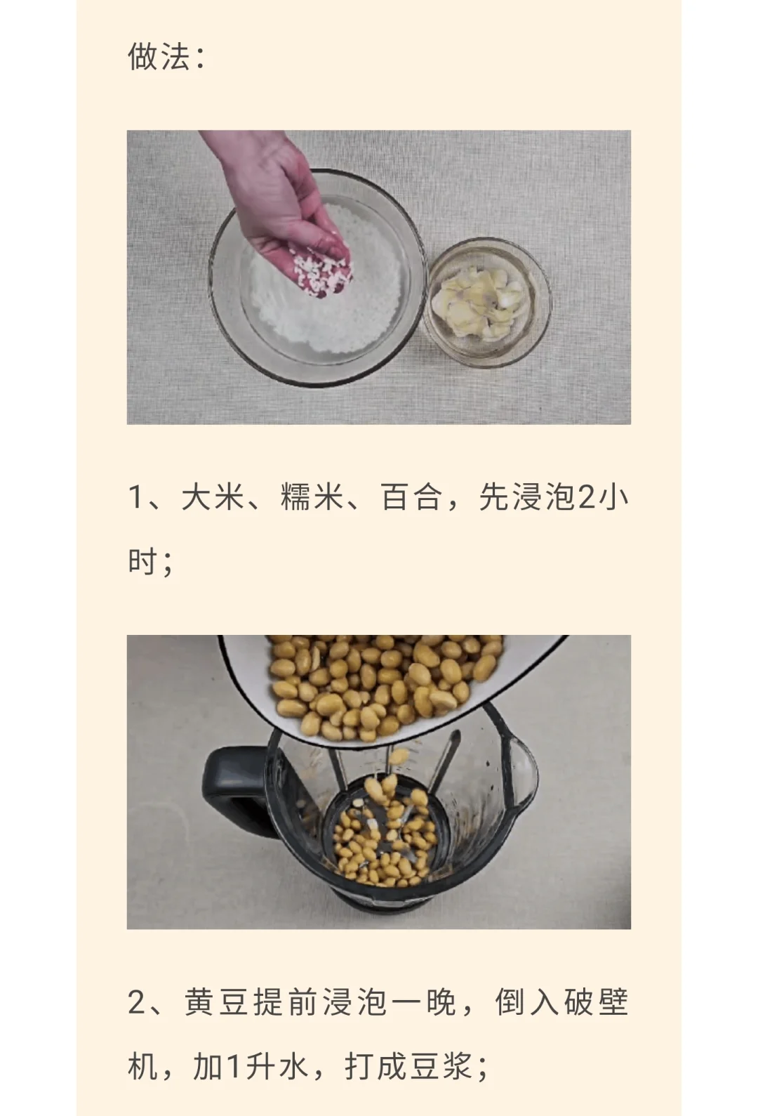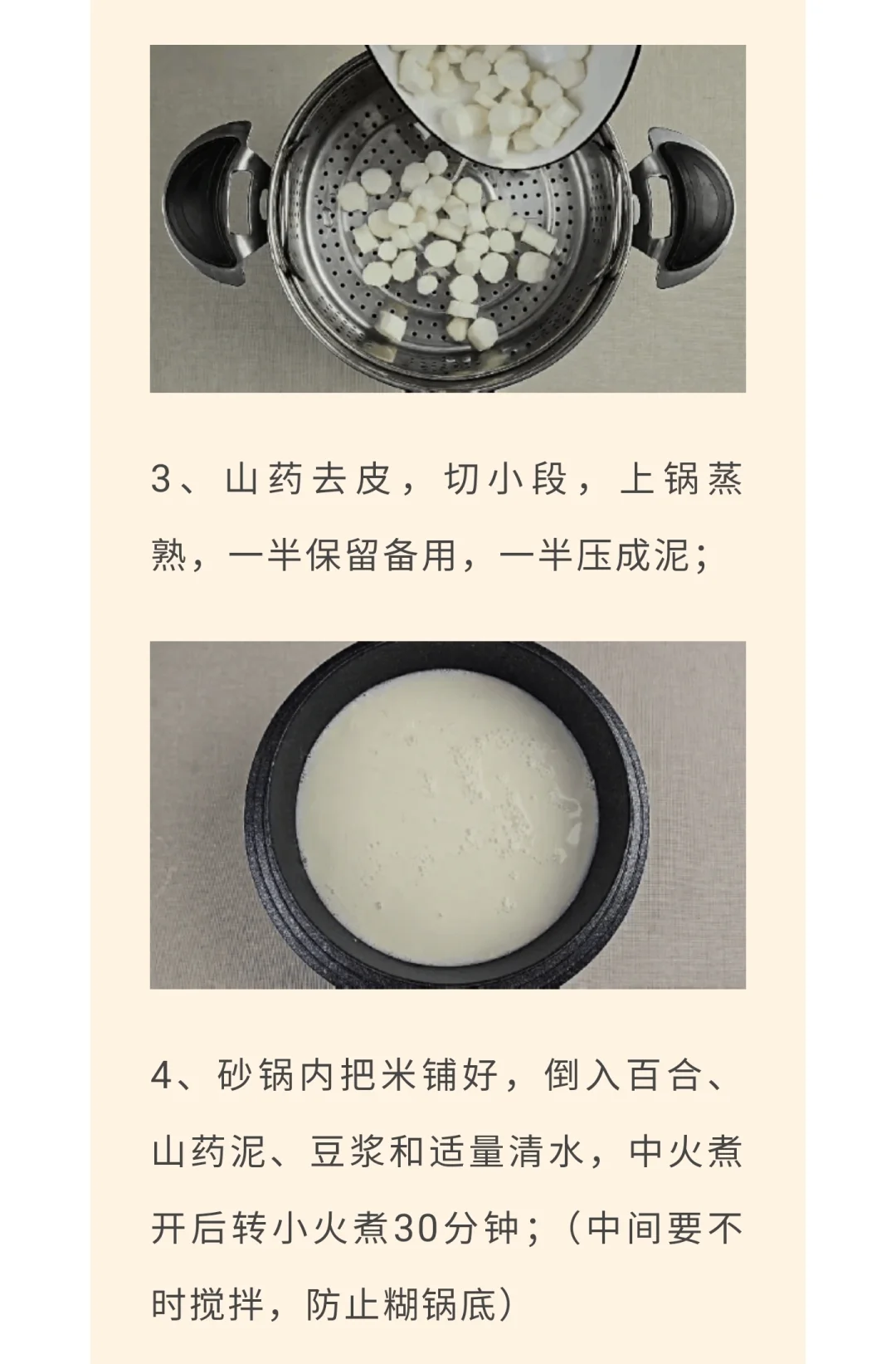 粳米60g、糯米40g、铁棍山药150g、百合10g、黄豆50g、冰糖、枸杞