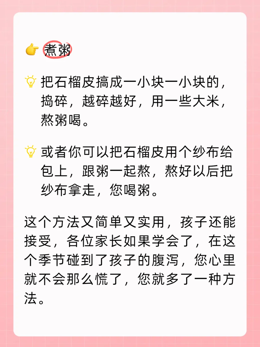 (二)或者你可以把石榴皮用个纱布给包上,跟粥一起熬,熬好以后把纱布拿走,您喝粥。