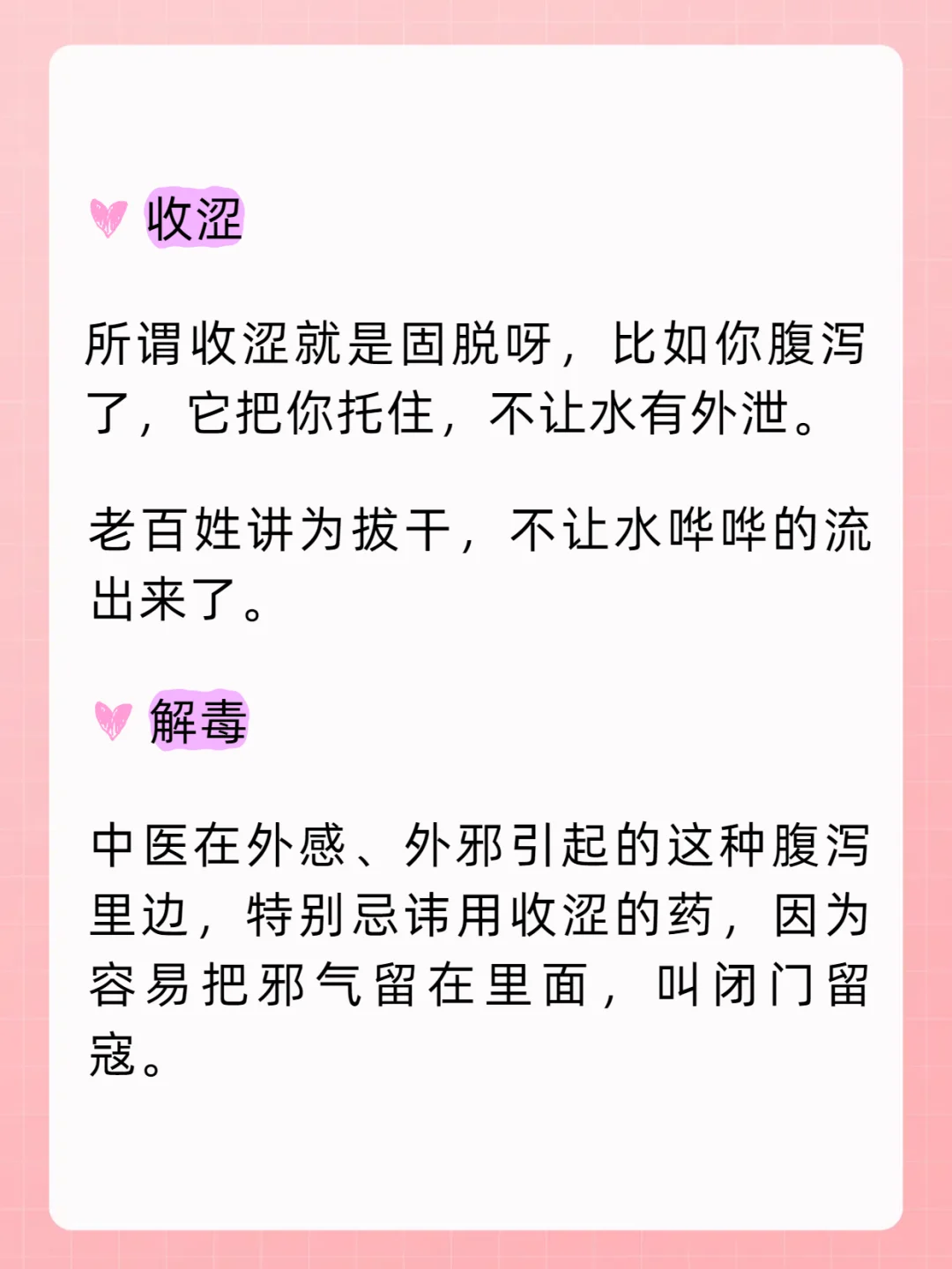 所谓收涩就是固脱呀,比如你腹泻了,它把你托住,不让水有外泄。老百姓讲为拔干,不让水哗哗的流出来了。