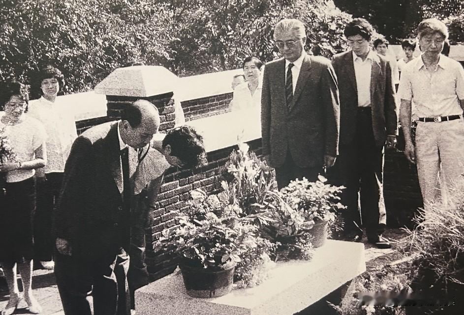 1986年6月,来自海内外的荣氏亲属齐聚无锡,祭扫荣德生先生墓。图为祭扫现场,澳门中华总商会主席马万祺先生作为荣毅仁的亲翁(荣毅仁的五女儿荣智婉远嫁澳门,是马万祺的儿媳),与荣毅仁(站立戴眼镜者)的女儿一同向荣德生先生墓鞠躬致敬。马万祺先生对荣氏家族充满敬意,他于1986年向荣毅仁先生赠送了荣德生铜像,这座铜像由佛山球墨铸铁研究所潘鹤设计,现立于无锡梅园。