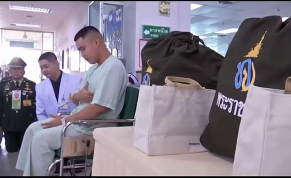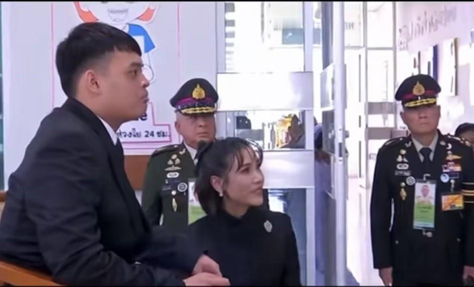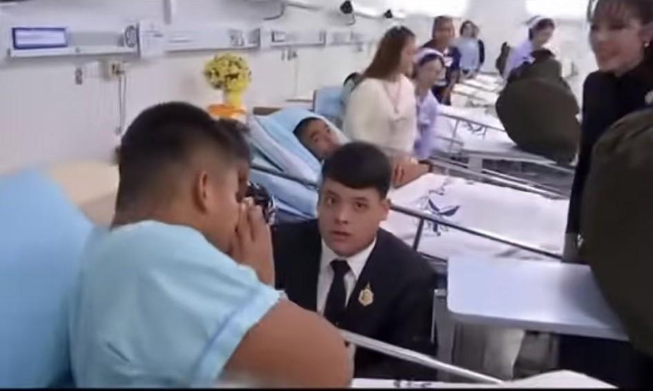 提帮贡能蹲下身子仰视普通人,这种镜头很难得啊!小王子只要不出大错,他爹的宝座百分百就是他的。 贵妃诗妮娜陪他一同来医院探望从前线退回来医治的伤员,赠送慰问品。 看得出他很重视医院的会面,衣着非常正式,深色正装白衬衫+西装同色系领带。他的脸只要瘦下来,就和玛哈神似。 诗妮娜也是一身黑,这些年她都在小王子身边照顾与陪伴,两人感情比王后与王子深。 除了病号正常坐卧,医生、其他军官、工作人员在提帮贡四周跪了一片。 到目前为止,提帮贡接王已成定局。