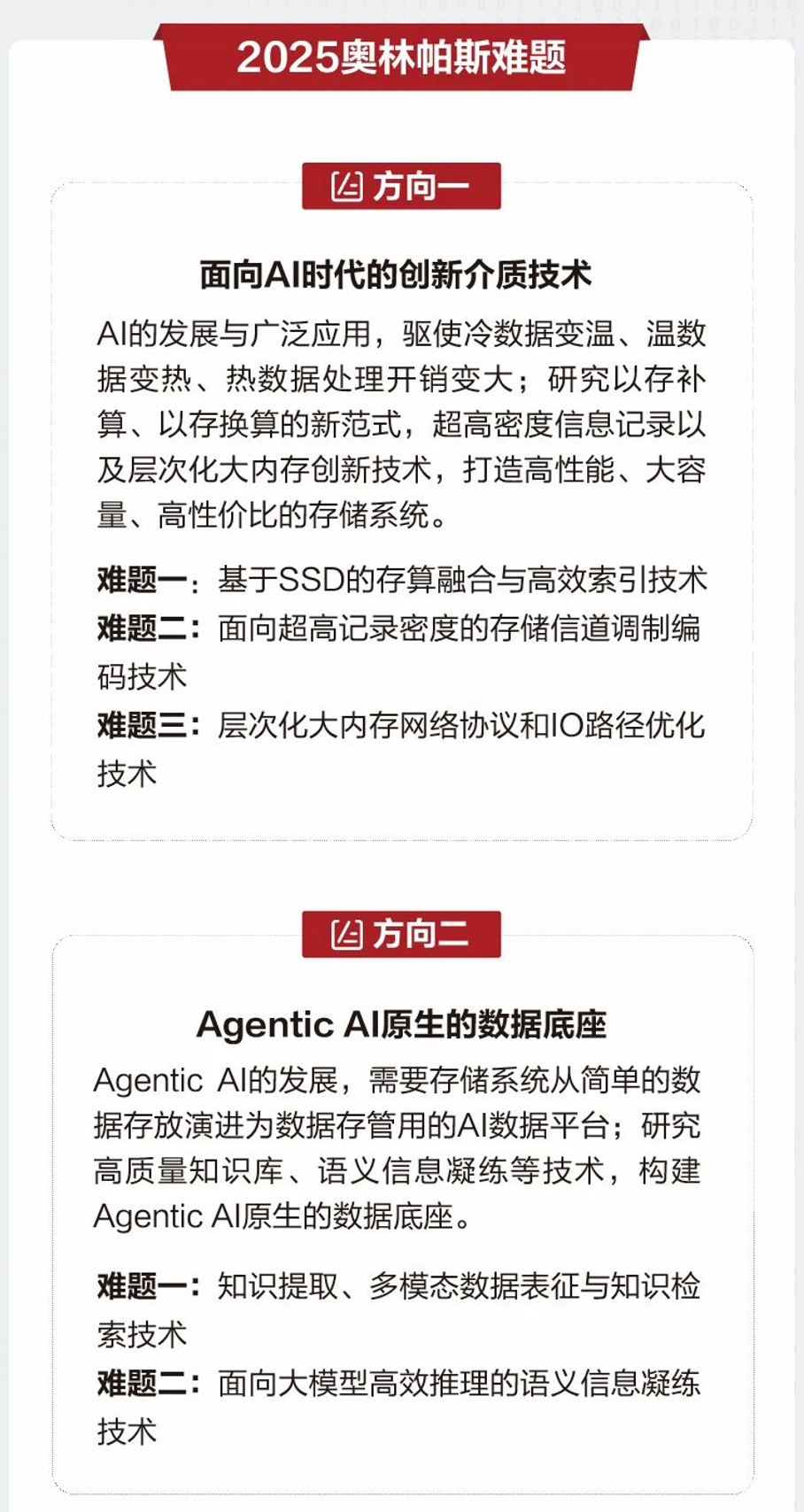 研究方向聚焦两大前沿领域:一是“面向AI时代的创新介质技术”,探索超高密度信息记录和层次化大内存技术,通过“以存补算、以存换算”提升计算效率;二是“AgenticAI原生的数据底座”,构建“数据存管用”一体化平台,突破知识提取、多模态表征等关键技术。