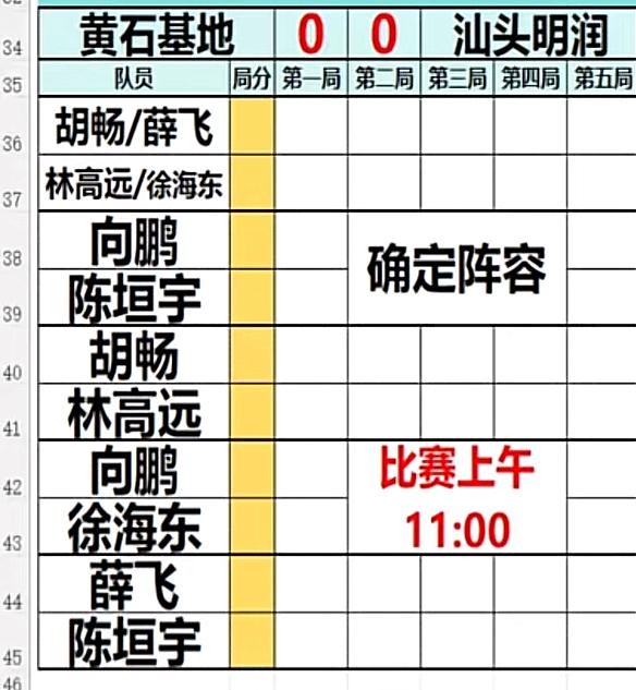 乒超联赛黄石基地VS汕头明润对阵表出炉——林诗栋不出战 第一盘 胡畅/薛飞VS林高远/徐海东 第二盘 向鹏VS陈垣宇 第三盘 胡畅VS林高远 第四盘 向鹏VS徐海东 第五盘 薛飞VS陈垣宇 出乎意料的林诗栋没有出战, 黄石基地在保护林诗栋, 这就是格局, 外战最重要,多哈冠军赛, 王楚钦不参加, 林诗栋还需要挑大梁, 黄石基地做的好啊! 这样黄石基地的实力就会削减, 明润也许进入决赛啦!