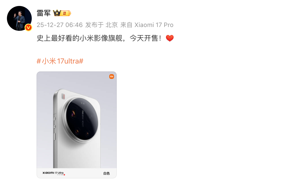 雷军此前在发布会上表示:“小米17Ultra不仅是一款手机,更是小米对极致科技与美学追求的体现。”