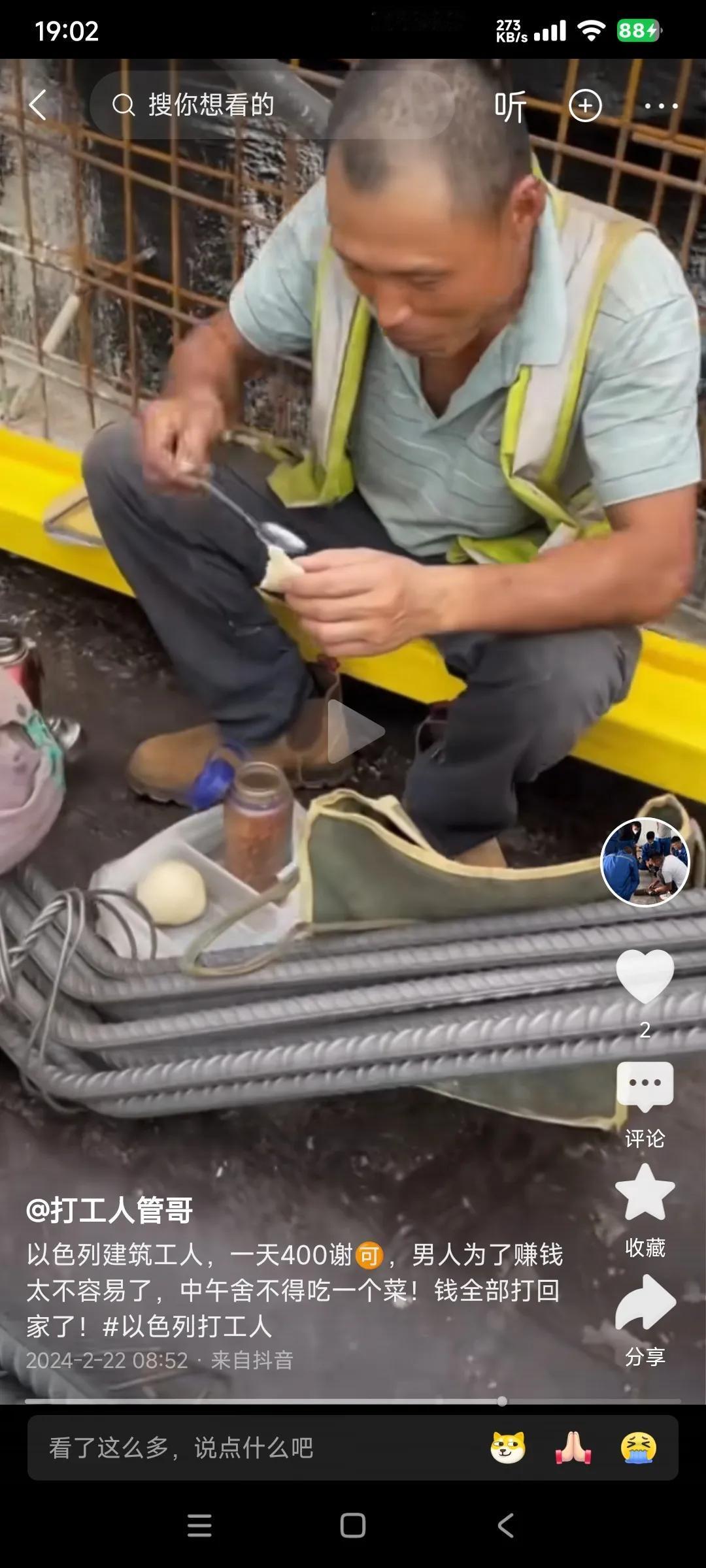 在以色列当普通建筑工人一天能赚多少钱? 在以色列务工的网友分享了自己的收入 他说普通建筑工人在以色列工作一天10个小时能赚400谢可,大概790元。 别看一个小时快八十元,但当地的沙漠地区,条件十分恶劣,这钱赚的非常辛苦。 另外一个问题是当地的物价非常昂贵,跟多工友为了省钱,午饭只吃一个菜。 一个月赚二万四千块钱,吃喝住用再省吃俭用一个月也得花费七八千左右。
