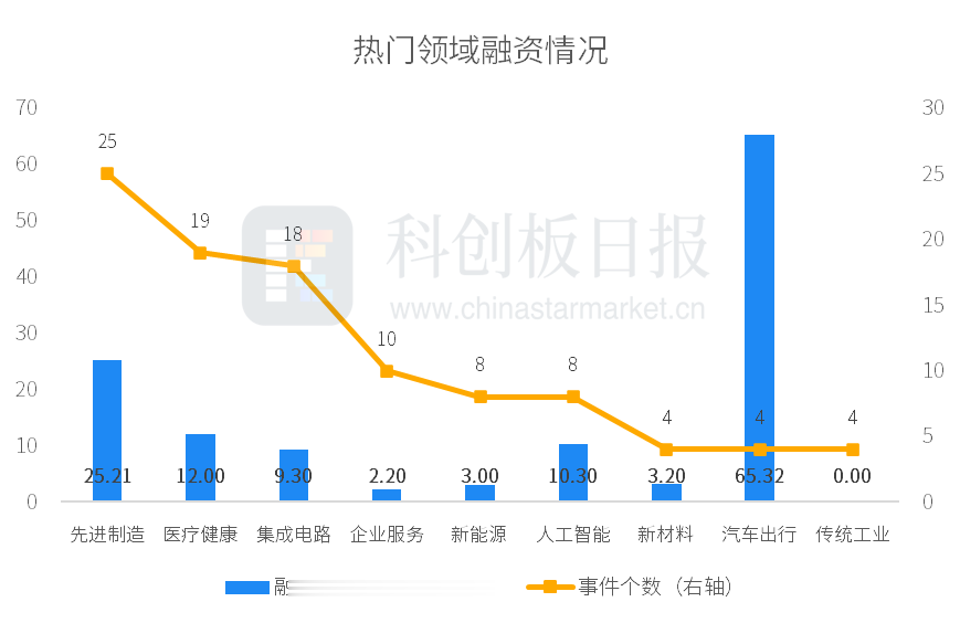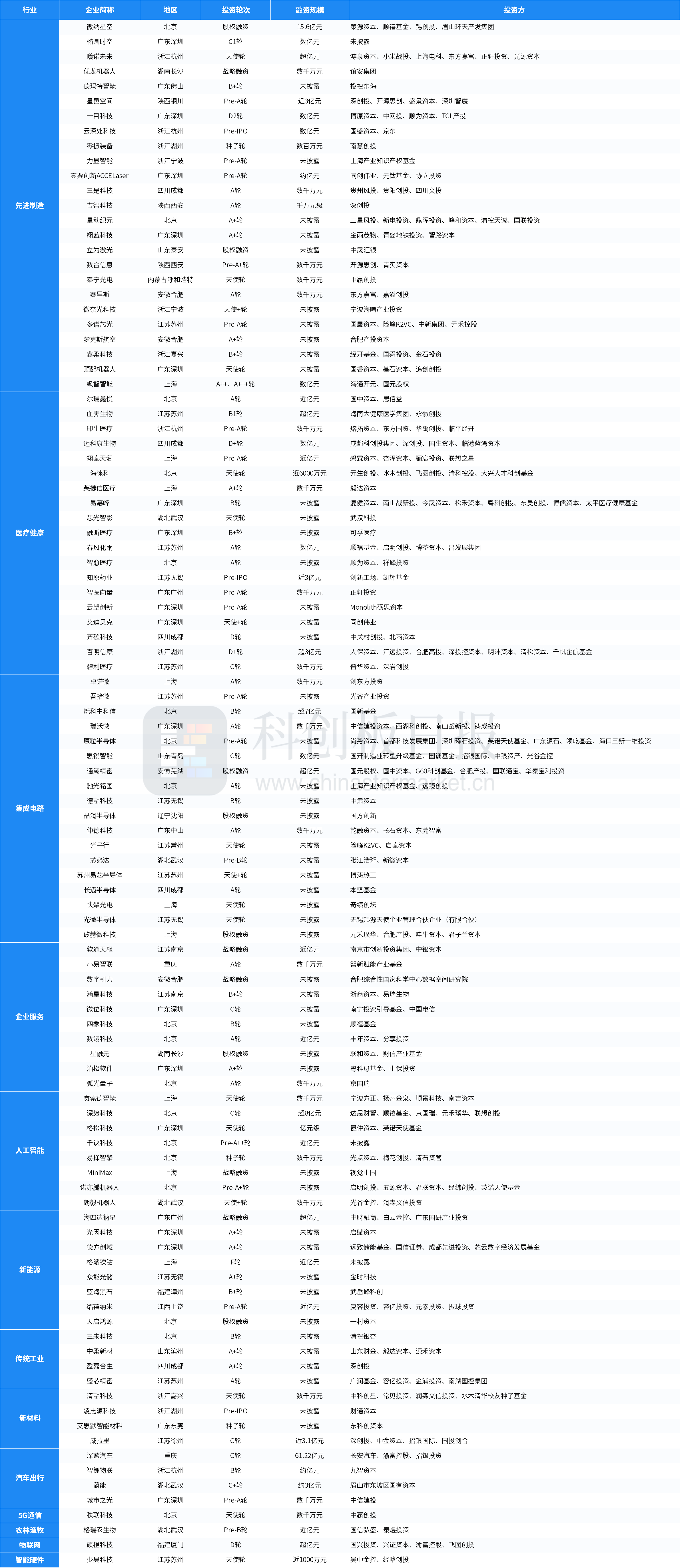 从投资事件数量来看,本周先进制造、医疗健康、集成电路、企业服务、新能源、人工智能等领域较活跃;从融资总额来看,汽车出行披露的融资总额最多,约65.32亿元。深蓝汽车完成由长安汽车、渝富控股、招银投资等共同参与的61.22亿元C轮融资,为本周披露金额最高的投资事件。