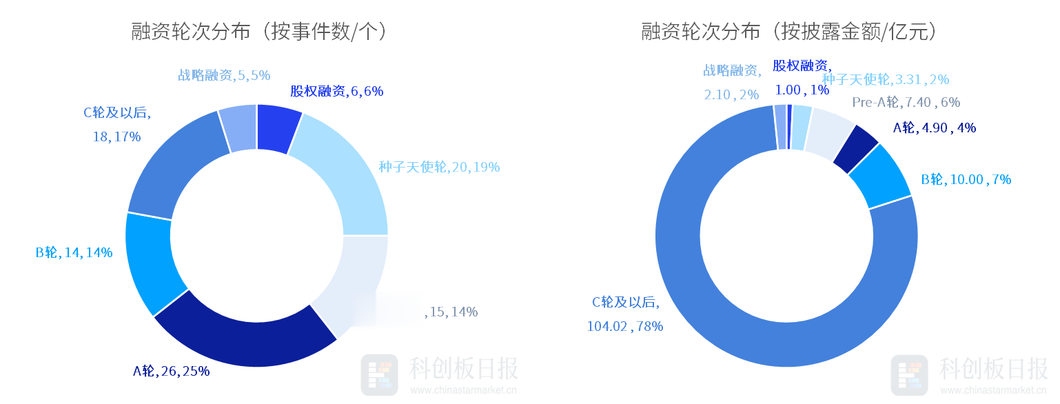 从投资轮次来看,除股权融资外,本周A轮融资事件数最多,发生26起,占比约25%;其次是种子天使轮,发生20起,占比约19%。从各轮次获投金额来看,C轮及以后披露的融资总额最高,约104.02亿元;其次是B轮,约10亿元。