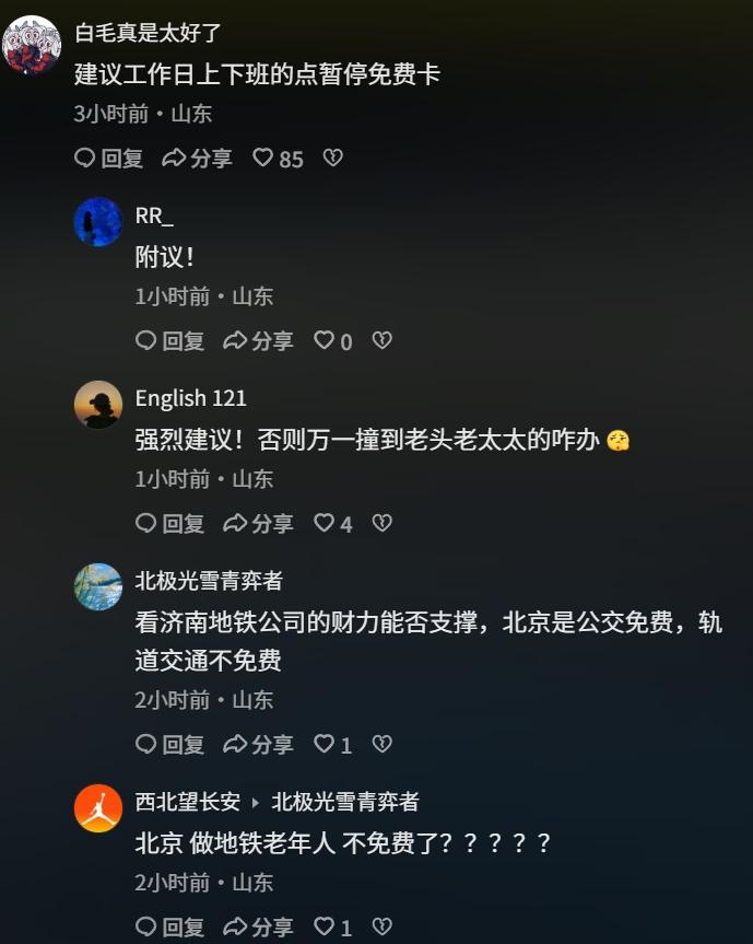 济南4号线开通,第一波乘客老年人居多,引发网友热议! 幸好是周末,如果是工作日,和上班族挤在一起,碰撞的风险还是挺大的。 很多网友建议,早晚高峰老年卡收费,或者就按照学生卡一样打4折,公交车免费! 这个建议得到了很多年轻人的认可! 地铁早晚高峰老年卡不免费,你是否赞同呢?