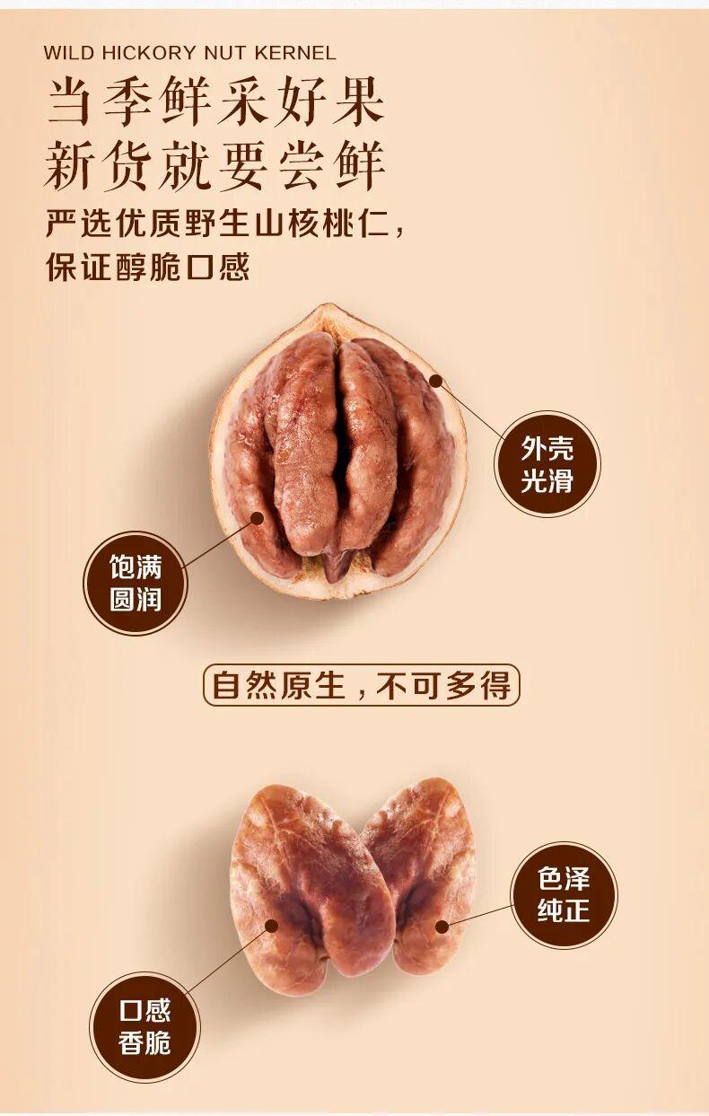 严选自然生长的野生山核桃仁,颗粒完整厚实,自带淡淡木本香气。低温轻焙工艺,保留原始酥脆口感与自然油脂香,不油腻不涩口,越嚼越回甘。
