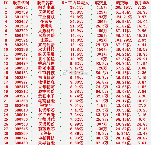 本周,整个市场“主力资金净流入”的30名单:阳光电源:5日主力净流入 38.1 亿元,成交量 115 万手,成交额 205.19 亿元天际股份:5日主力净流入 30.8 亿元,成交量 125 万手,成交额 61.45 亿元工业富联:5日主力净流入 27.8 亿元,成交量 193 万手,成交额 124.21 亿元多氟多:5日主力净流入 24.9 亿元,成交量 266 万手,成交额 95.93 亿元德明利:5日主力净流入 21.5 亿元,成交量 26.3 万手,成交额 61.87 亿元天赐材料:5日主力净流入 15.9 亿元,成交量 150 万手,成交额 67.17 亿元