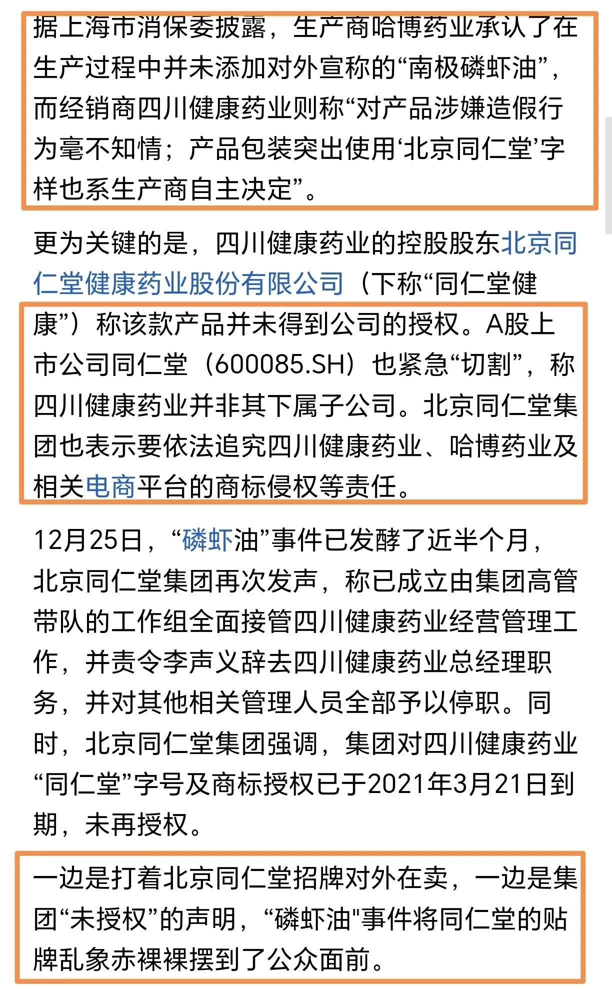 同仁堂“磷虾油”事件目前已经初步清晰了。 北京同仁堂旗下425家企业频繁对外授权、贴牌、代工。 所以市面上才有这么多打着同仁堂牌子的保健品和产品在销售。 毕竟贴牌的钱实在是好挣,不用自己出钱出力,就授权给个牌子,每年就能有大笔资金入账,属实是好生意。 即使有些商家搞擦边操作、违规侵权,但在利益面前也可以“睁一眼闭一眼”过去。 这就是为什么“同仁堂磷虾油”明明没有“授权”,却在各大网购平台上卖了那么久、那么多,还不被起诉的原因。 现在出事了,正义切割、严正声明就来了。 现在问题已经不仅仅是同仁堂一家的事情,其他中药老字号的贴牌、授权、代工现象估计也不会少,这明显会引起大家对中药品牌产品的不信任和怀疑。 牌子砸了,再怎么装起来,人民也不会信任了。 国产南极磷虾油 同仁堂磷虾油 内服磷虾油 国产磷虾油 同仁堂磷虾事件