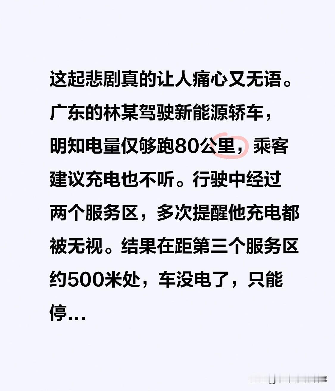 震撼!这起悲剧令人痛心又无奈。广东林某驾新能源车,明知电量仅够跑80公里,不听乘客充电建议。途中经两服务区,多次提醒均被无视。距第三个服务区约500米,车没电停慢车道。林某与乘客下车推车,走20米遭大货车追尾,两人抢救无效离世。 该司机侥幸心理重,错过诸多充电机会。开车上路,尤其新能源车,要提前规划,勿拿生命冒险。望大家吸取教训,安全第一! 新能源车事故 新能源车出险