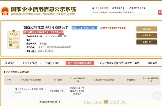 12月26日,上游新闻记者调查发现,涉事App开发公司已被市场监管部门列入经营异常名录。记者以市民身份致电该公司辖区南京江北新区管理委员会市场监督管理局问询,一名工作人员解释称,企业被列入经营异常,说明执法人员在注册地址无法找到该公司,且无法取得联系。“3500元借款10天需还4970元,明显涉嫌高利贷,建议向金融管理部门反映。”
