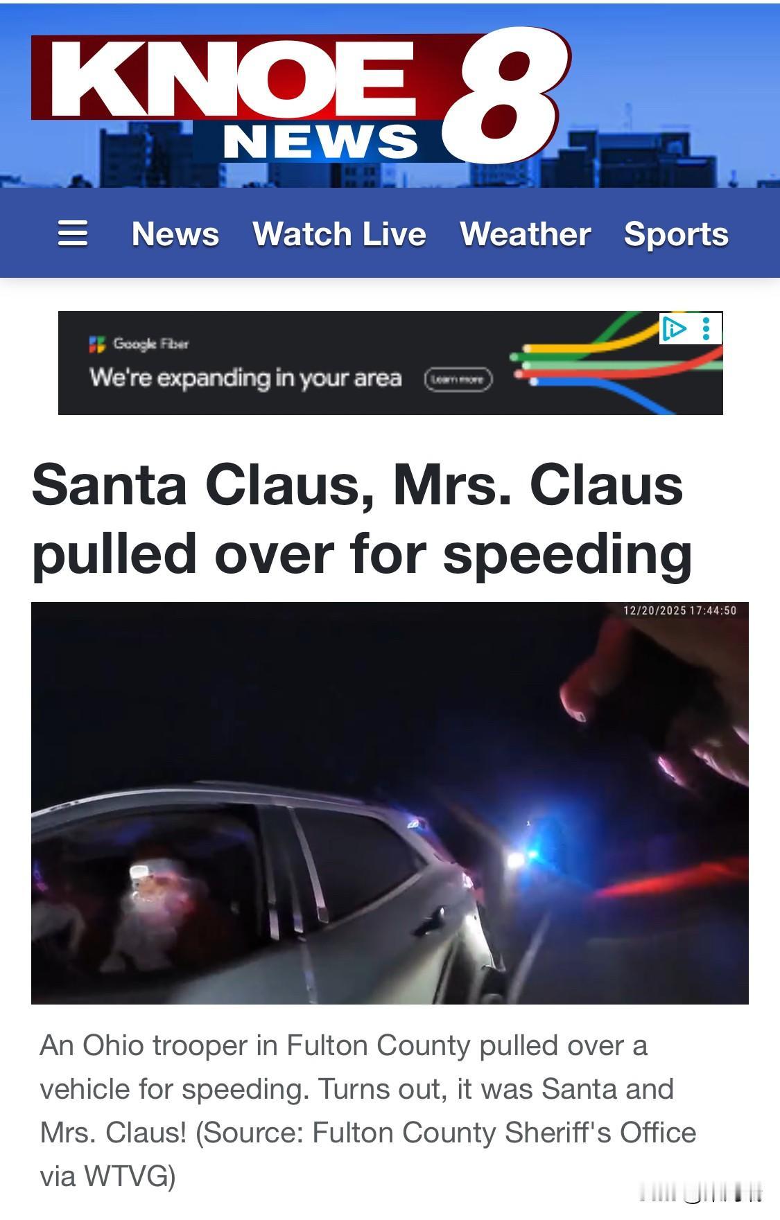 故事发生在美国俄亥俄州(Ohio)的富尔顿县(Fulton County),根据2025年12月披露的执法记录仪视频,事件的具体情节如下: 当地警长办公室的一名副警官在12月20日拦下了一辆超速行驶的福特SUV,发现驾驶员和乘客竟是装扮成圣诞老人和圣诞奶奶的一对夫妇。 搞笑对话:圣诞老人在停车后主动告知警官自己持有隐蔽持枪证(CCW)。警官大笑调侃道:“圣诞老人居然有持枪证?这世道真是不好混啊!”圣诞老人幽默回应:“你得保护好自己。”圣诞奶奶也补了一句:“北极也和以前不一样了!” 这对夫妇解释称,他们正赶往女儿工作的地方,准备给同事们送去圣诞惊喜。警官最终没有开罚单,只给了他们一个口头警告,并与圣诞老人合影留念,愉快地放行了。