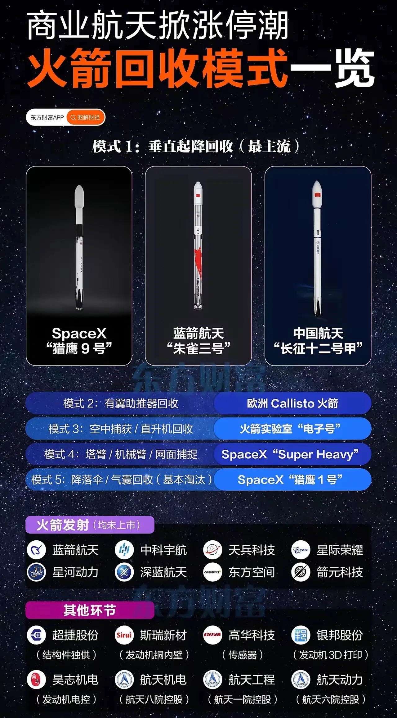 商业航天回收产业链概念股梳理!商业航天回收产业链概念股涵盖上游材料与核心器件、中游制造与发射服务、下游应用与数据服务等环节,以下是部分相关概念股介绍:一、上游材料&核心器件:- 佳缘科技:为智神星一号提供抗辐射芯片,航天级芯片壁垒极高,在火箭导航中发挥重要作用。- 中复神鹰:是碳纤维箭体材料龙头,可回收火箭量产将带动其产品需求增长,单箭用量可达35%。- 神剑股份:其高温合金涡轮泵部件进入天兵科技供应链,涡轮泵部件是火箭发动机的核心部件。二、中游制造&发射服务:- 广联航空:为引力二号做总装,自建海南制造基地,2026年产能预计达20发/年,在火箭制造环节具有一定优势。- 盟升电子:卫星导航终端适配10余家火箭公司,2025年订单有望破15亿,在火箭导航领域有广泛布局。- 优刻得 - W:提供云端仿真计算平台,可帮助火箭研发缩短20%周期,绑定了火箭研发的数字化转型需求。卫星制造与运营相关- 中国卫星:承担多系列卫星总体设计等任务,可回收火箭降成本能推动卫星互联网星座建设,为卫星制造带来订单。- 航天发展:在军工仿真领域领先,通过子公司从事商业低轨卫星运营及数据应用服务,可回收火箭推动卫星星座组网。- 航天电子:航天电子在火箭测控系统、星载计算机等关键领域的市场占有率极高(超过90%)。除了蓝箭航天,它深度参与了国家所有重大航天工程,并为国内几乎所有的商业火箭和卫星公司提供核心配套。- 航天动力:公司商用可回收火箭发动机市场份额超过80%,是蓝箭航天等头部企业的重要配套商。公司已拿下了蓝箭航天2026年计划15次发射对应的全部配套订单。三、下游应用&数据服务:- 西测测试:主要从事卫星载荷环境试验,2024年新增订单超8亿,受益于星网项目等下游应用的发展。- 泛亚微透:其卫星天线透波材料打破国外垄断,已进入国际供应链,在卫星通信等下游应用领域有一定市场份额。- 航宇科技:提供的是发动机中的各类环锻件和模锻件,具体包括涡轮盘、泵壳体、法兰等关键部件。产品已成功应用于蓝箭航天的“朱雀”系列火箭。航宇科技也是九州云箭、星河动力、天兵科技、东方空间等几乎所有国内头部民营火箭公司的主流供应商。此外,还有一些公司因为火箭提供耗材而与商业航天回收产业链相关,如为火箭发动机提供推力室内壁铜合金材料的斯瑞新材,提供紧固件的超捷股份,掌握高温合金返回料循环再生技术的上大股份等 。