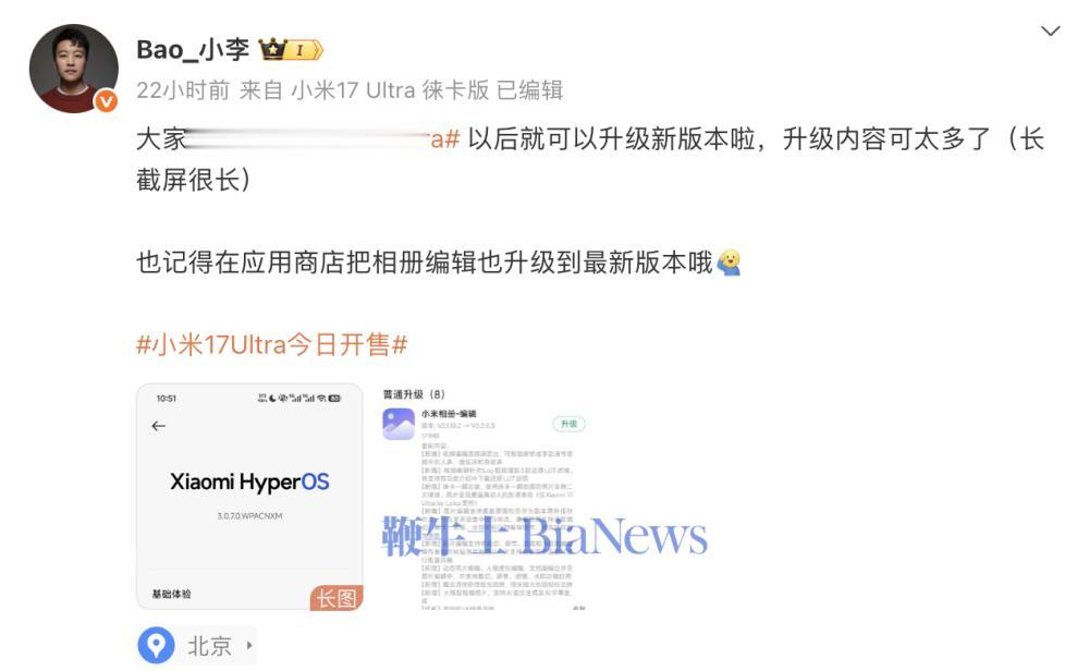 12月27日,小米相机部产品经理“Bao_小李”发文称,小米17Ultra系列新机已开启澎湃HyperOS3.0.7.0.WPACNXM版本升级。