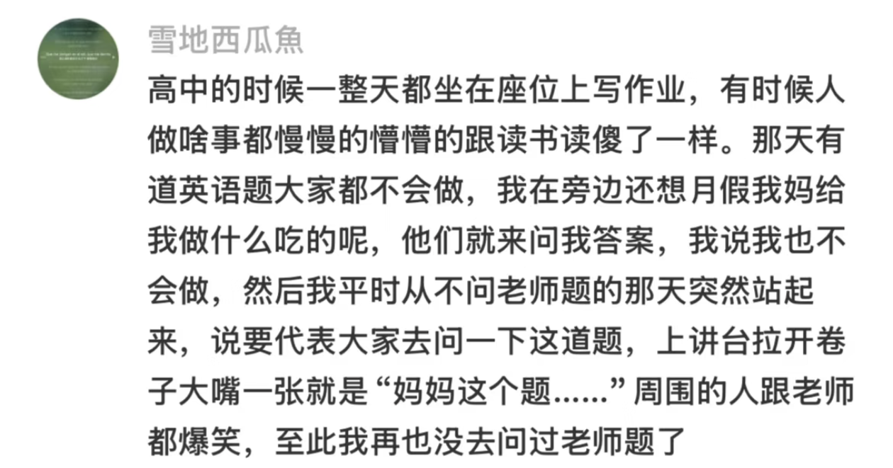 上讲台拉开卷子大嘴一张就是"妈妈这个题......"周围的人跟老师都爆笑,周围的人跟老师都爆笑