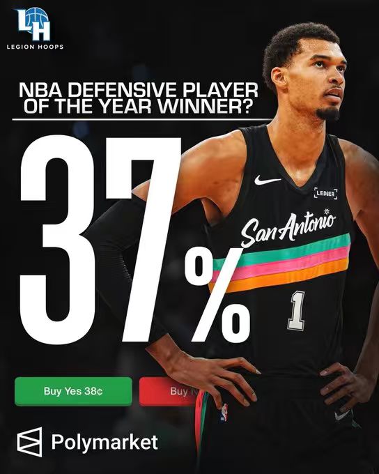 根据预测网站Polymarket的数据,文班成为本赛季最佳防守球员的概率为37%。