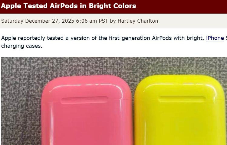 据悉,苹果曾测试第一代AirPods的彩色版本,其充电盒采用粉色、黄色等鲜艳配色,风格神似经典的iPhone5c机型。