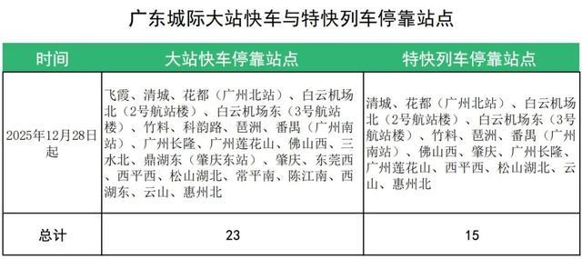 调整后,广东城际全天将开行5条站站停交路,分别为“飞霞-花都”“花都-竹料”“花都-东莞西”“白云机场北-佛山西”“肇庆-惠州北”;同时开行7条特快列车、大站快车交路,包括“花都-肇庆”“花都-惠州北”“肇庆-惠州北”“白云机场北-佛山西”“白云机场北-惠州北”“番禺-惠州北”“飞霞-花都”。