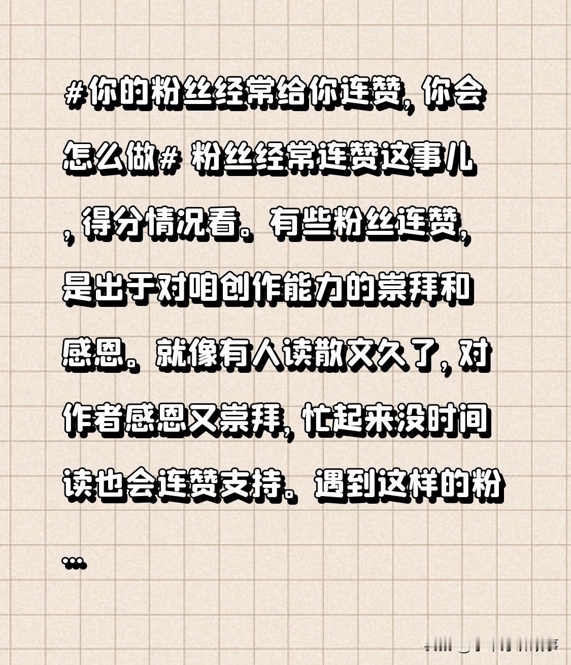 粉丝经常连赞这事儿,得分情况看。有些粉丝连赞,是出于对咱创作能力的崇拜和感恩。就像有人读散文久了,对作者感恩又崇拜,忙起来没时间读也会连赞支持。遇到这样的粉丝,我肯定得感激,反手就关注上。 还有些是忠实粉丝或者熟人,他们连赞是真心支持,希望咱文章活跃度高,能有更多人看。这种我也会记在心里,他们有问题我耐心解答,文章我也认真读,给真实反馈。 不过也有烦恼,连赞可能影响账号流量,甚至有人担心会被封禁。遇到这种情况,我可能会委婉提醒粉丝别频繁连赞,咱一起维护好账号,细水长流嘛。