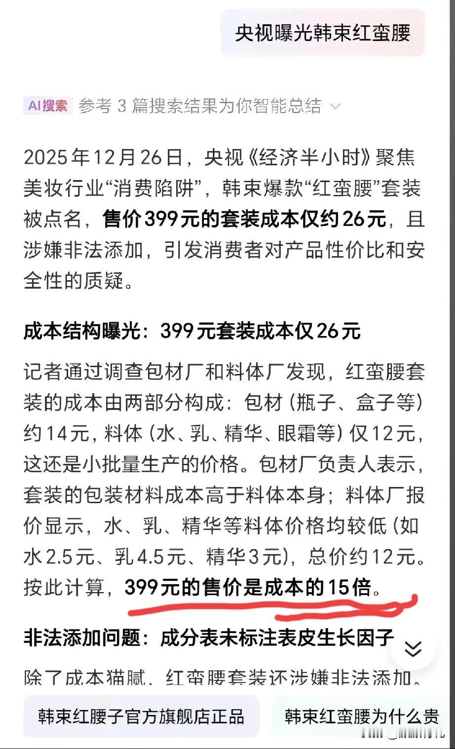 一觉醒来!央视又曝光了!! 韩束399元的“红蛮腰”三件套,成本竟然只有26元!其中包装材料14元,料体12元。 难怪央视说它的质量“堪忧”,使用后会有“皮肤不适”的情况! 这玩意儿的良心哪去了? 整个美容行业利润惊人的不亚于毒品贩卖!!甚至于比毒品贩卖更容易赚钱,因为美容行业合法经营,而且还可以通过各种手段让消费者无法维权,那你就只能自认倒霉。消费者的苦不堪言啊! 要不是央视节目的曝光,很多用户尤其是女性用户,还在沉湎于直播间里,那些头部网红和厂商砍了一遍又一遍价,最后卖399元的化妆品套装。 突然就懂了,为什么很多头部网红带货都爱选择带化妆品,这利润空间用“一本万利”来形容都不足为奇了。 韩束真的塌房了吗?你们怎么看!