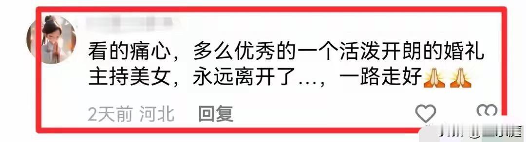 河北38岁知性优雅的美女主持人常雪莉永远的离开了!她被一辆“老头乐”撞上后,失去了年轻美好的生命! 常雪莉是一名婚礼主持人,因口才出众,样貌姣好,深得广大客户喜欢和信赖。生活中,她性格、为人都很好,无论是对街坊邻居还是陌生人,她都很热心。 然而,突如其来的一天,悲剧却降临在她身上。那么年轻的她,甚至都来不及向家人和朋友道别就失去了生命! 悲剧发生后,其好朋友悲痛发声,道出了常雪莉离世的原因,很多认识她的人也纷纷发声表达了惋惜。 人生最大的遗憾,莫过于生离死别!如若可以好好的说声再见,起码遗憾也会少一些,可她遭遇的那场意外显然成了亲朋好友间最大的意难平。 38岁的年纪,真的让人无比心疼,这个岁数的年轻人,孩子还小,而老人已经渐渐老去,正是需要担起家庭责任的时候。 可因为那辆老头乐,所有的一切都被改变了! 所谓的老头乐,即老人代步车。因其价格低廉,一度风靡全国各地。但因种种安全隐患,全国很多地方早就开始严格查处,严禁不合规的老头乐走上公共道路。 人生真的太过无常了,明天和意外究竟谁先降临,谁也不会知道。能做的只有,好好珍惜每一天! 希望大家,无论开什么车子都要万分注意。无论何时何地都请谨记:谨慎慢行,注意礼让行人! 常雪莉终究是可惜了,她那么漂亮,还那么年轻,却止步于38岁这一年。现在马上都要跨年了,不知道她的家人该如何接受这个残酷的现实啊?[祈祷][祈祷][祈祷]