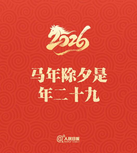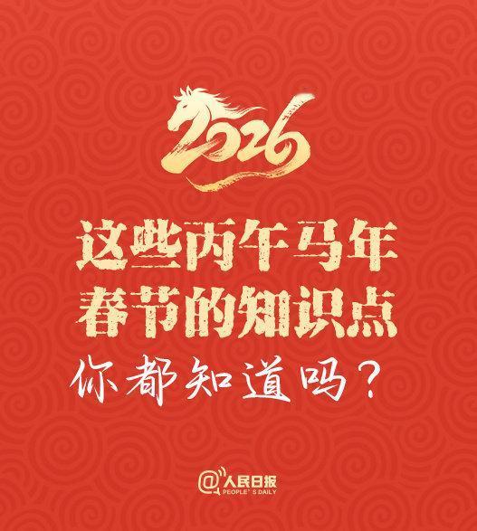 【盼!50天后是除夕】春节是中华文化最古老、最重要的传统节日。这些丙午马年春节的知识点,你都知道吗? [手指比心]马年先立春再春节 [手指比心]2026马年除夕是年二十九:今年还是没年三十从2025年至2029年,连续5年都没有年三十,都是“大年二十九” 50天后是除夕 [手指比心]2026年3月才过马年元宵 [手指比心]马年春节假期有9天 [手指比心]马年春节已是“七九天” [手指比心]马年大年初二是雨水节气 [手指比心]马年春节是第二个非遗版春节 [手指比心]马年春节又能看冬奥:春节期间,为中国冰雪健儿加油