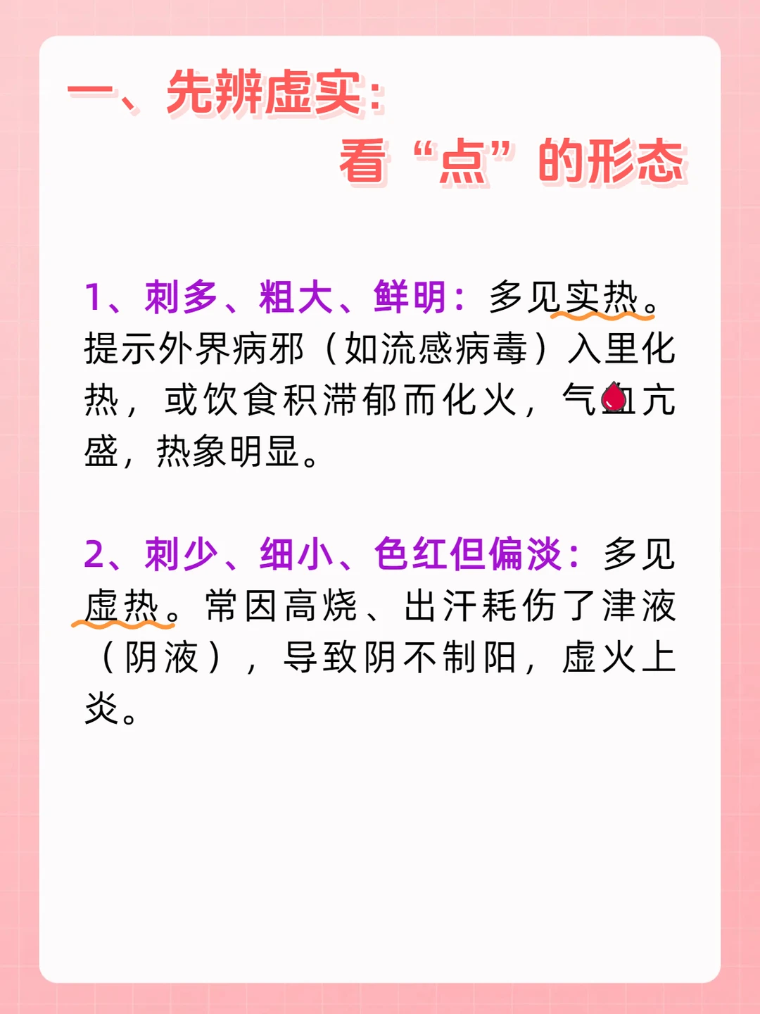 [向右R]刺少、细小、色红但偏淡:多见虚热。常因高烧、出汗耗伤了津液(阴液),导致阴不制阳,虚[火R]上炎。