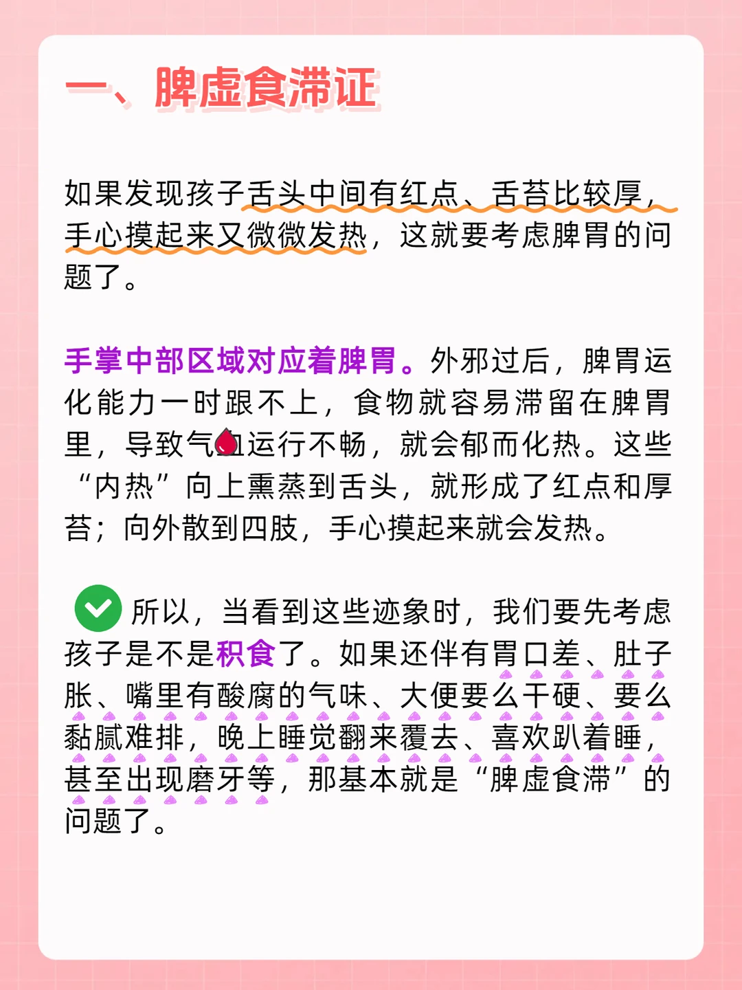 如果发现孩子舌头中间有红点、舌苔比较厚,手心摸起来又微微发热,这就要考虑脾胃的问题了。