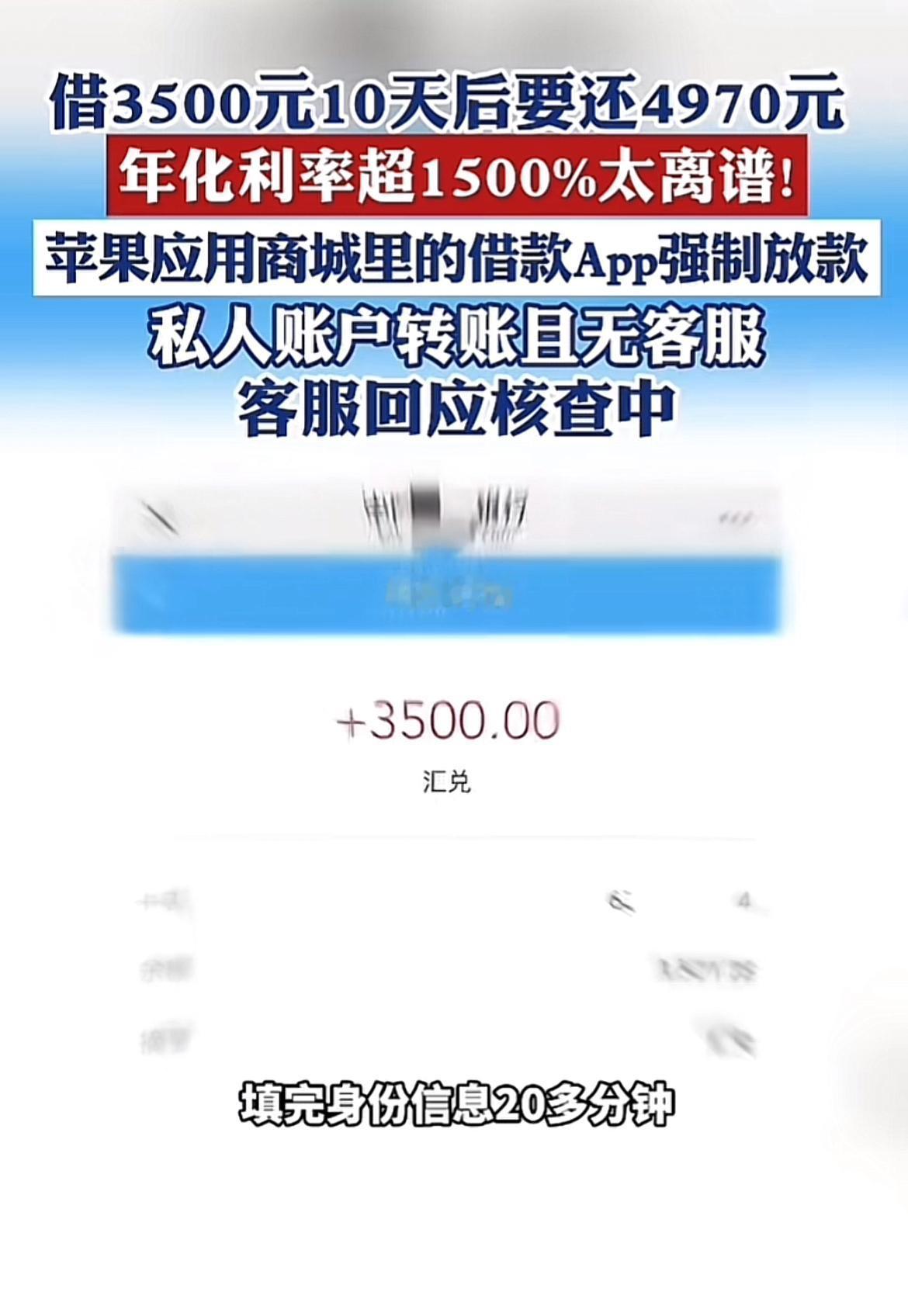 苹果应用商店这次可真是出大问题了,居然惊现年化利率超1500%的高利贷App。河北承德的宫先生在苹果应用商场下载“臻有钱”App,填完资料没经过任何审核,20多分钟就收到3500元转账,10天后却要还4970元,钱还是从私人账户转来的。想联系客服,还得下载个在应用商店搜不到的软件。这哪是借款,分明是抢钱!而且涉事App开发公司还被列入经营异常名录。苹果公司客服说正在核查,希望能赶紧处理,别让这种高利贷App继续坑害用户了。