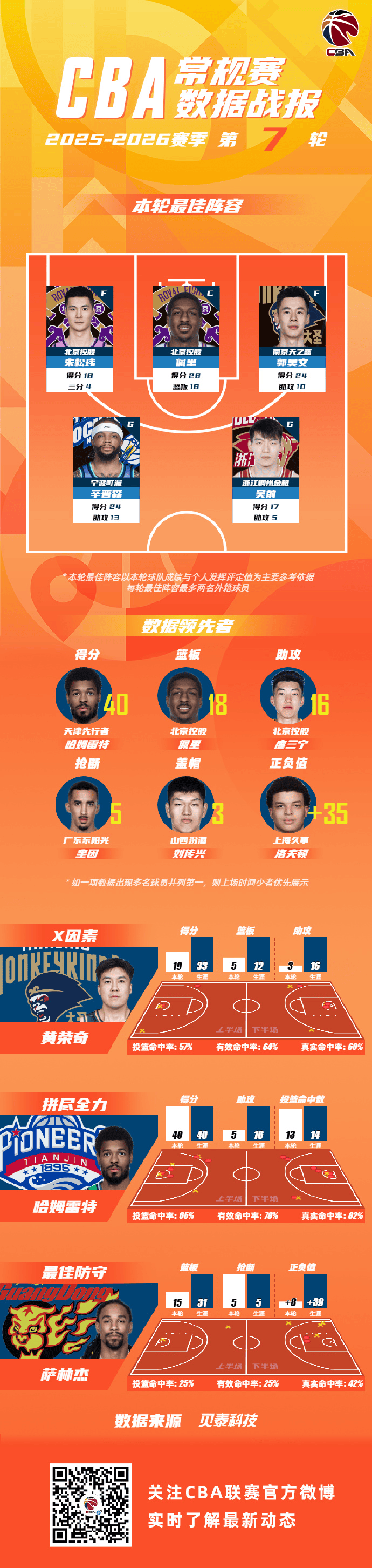 2025-2026赛季CBA联赛常规赛第7轮结束较量,来自北控男篮的朱松玮和佩里,南京男篮的郭昊文,宁波男篮的辛普森和浙江男篮的吴前入选CBA联赛常规赛第7轮最佳阵容!