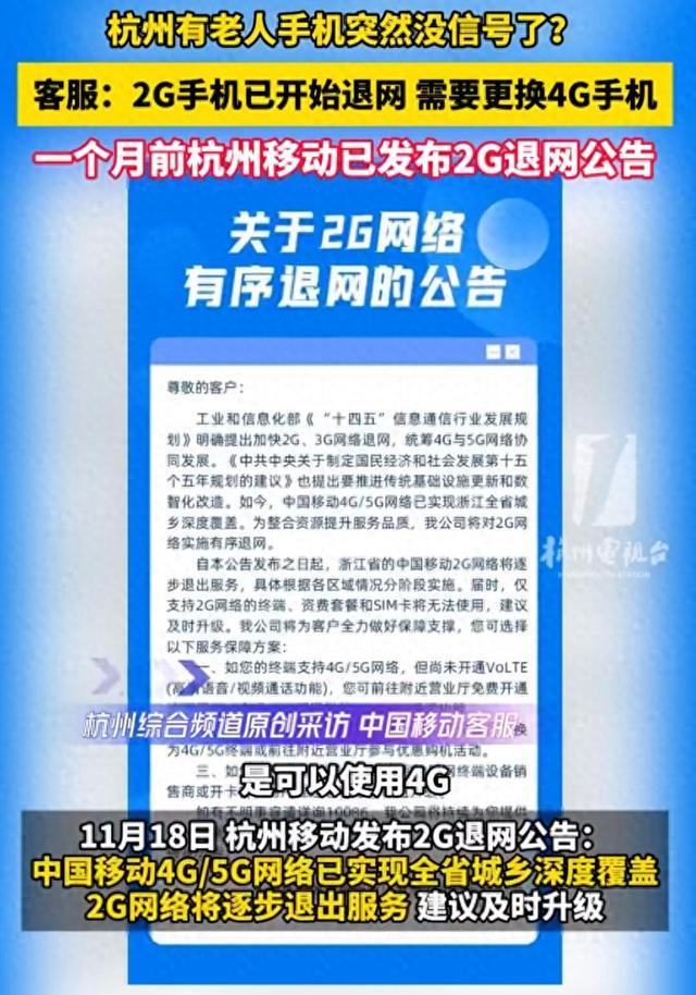 据悉,11月18日,杭州移动发布2G退网公告:中国移动4G/5G网络已实现全省城乡深度覆盖,2G网络将逐步退出服务,建议及时升级。(杭州综合频道)